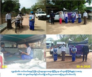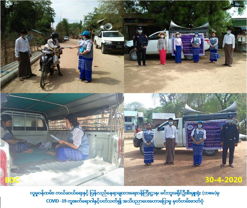 လူမှုဝန်ထမ်း၊ ကယ်ဆယ်ရေးနှင့် ပြန်လည်နေရာချထားရေးဝန်ကြီးဌာန၊ ဘေးအန္တရာယ်ဆိုင်ရာစီမံ ခန့်ခွဲမှုဦးစီးဌာန၊ မင်းဘူးခရိုင်ဦးစီးမှူးရုံးမှ တာဝန်ရှိသူများသည် (၃၀-၄-၂၀၂၀) ရက်နေ့တွင် မင်းဘူး (စကု)မြို့နယ်၊ မယ်ဘေ့ကုန်းကျေးရွာ၊ ခြင်ထောင်ကျေးရွာ၊ ကျွဲကျကျေးရွာ၊ ကျောက်စံကျေးရွာ၊ ရွာသစ် ကုန်းကျေးရွာ၊ နိဗ္ဗာန်ကျွန်းကျေးရွာ၊ ပေါက်လေးပင်ကျေးရွာ၊ ပေါက်ငူကျေးရွာနှင့် မန်းကျိုးကျေးရွာ များအတွင်း Covid-19ရောဂါကူးစက်ပျံ့နှံ့မှုမဖြစ်ပွားစေရန် သိရှိလိုက်နာ ဆောင်ရွက်ရမည့် အချက်များကို ခရိုင်မီးသတ်ဦးစီးဌာနမှ တာဝန်ရှိသူများ၊ကျေးရွာအုပ်ချုပ်ရေးမှူးများ၊ ရပ်မိရပ်ဖများနှင့် ပူးပေါင်း၍ အသိပေးဆောင်ရွက်ခဲ့ကြောင်း သတင်းရရှိပါသည်။