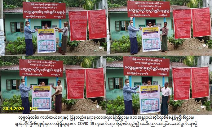 လူမှုဝန်ထမ်း၊ ကယ်ဆယ်ရေးနှင့် ပြန်လည်နေရာချထားရေးဝန်ကြီးဌာန၊ ဘေးအန္တရာယ်ဆိုင်ရာစီမံခန့်ခွဲမှုဦးစီး ဌာန၊ ဖျာပုံခရိုင်ဦးစီးမှူးရုံးမှတာဝန်ရှိသူများသည် (၃၀-၄-၂၀၂၀) ရက်နေ့တွင် ဒေးဒရဲမြို့နယ်၊ နောက်ပြန်တိုးကျေးရွာ၊ စစ်ပိုင်းရွာ၊ တိုက်စုရွာ၊ ရွာသာကြီးရွာနှင့် အေးသာယာရွာတို့၌ COVID-19 ကူးစက်ရောဂါနှင့်စပ်လျဉ်း၍ ဆောင်ရန်/ရှောင်ရန်အချက်များကို အသိပညာပေးနှိုးဆော်ခဲ့ပြီး ဗီနိုင်းပိုစတာများ ပေးအပ်ခဲ့ပါကြောင်း သတင်းရရှိပါသည်။