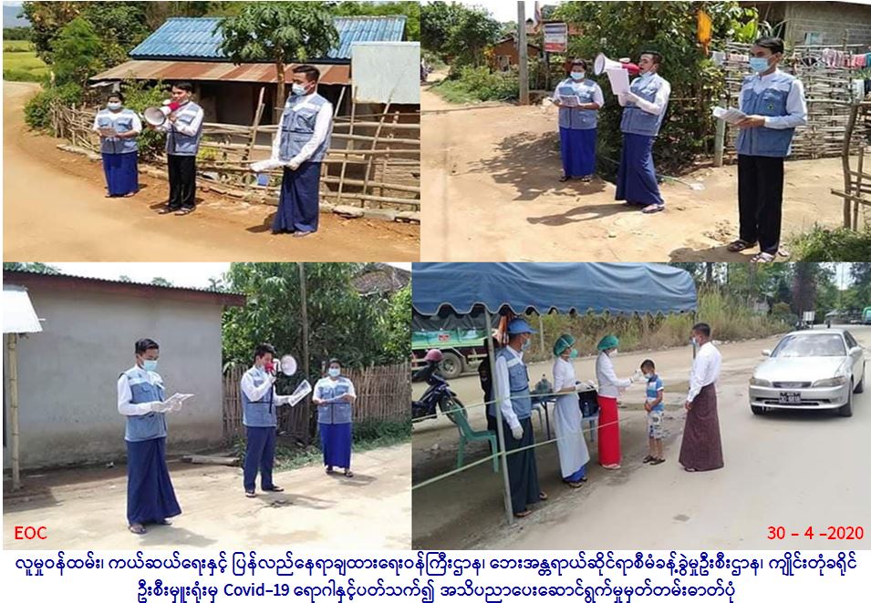 လူမှုဝန်ထမ်း၊ ကယ်ဆယ်ရေးနှင့်ပြန်လည်နေရာချထားရေးဝန်ကြီးဌာန၊ ဘေးအန္တရာယ်ဆိုင်ရာစီမံခန့်ခွဲမှုဦးစီးဌာန၊ ကျိုင်းတုံ ခရိုင်ဦးစီးမှူးရုံးမှ တာဝန်ရှိသူများသည် (၃၀ – ၄ -၂၀၂၀)ရက်နေ့တွင် မြို့နယ်အထွေထွေအုပ်ချုပ်ရေးဦးစီးဌာန၊ မြို့နယ်ပြည်သူ့ ကျန်းမာရေးဦးစီးဌာန၊ မြို့နယ်ကြက်ခြေနီအသင်းတို့နှင့်ပူပေါင်း၍ ကျိုင်းတုံ – တာချီလိတ်၊ နောင်နွန်းစုပေါင်းဂိတ်၌ ကျိုင်းတုံ မြို့တွင်းသို့ အ၀င်/အထွက်ယာဉ်လိုင်းများတွင် စီးနှင်းလိုက်ပါသောခရီးသည်များအား ကျန်းမာရေးစစ်ဆေးခြင်း၊ မှတ်တမ်း ကောက်ယူခြင်းနှင့် ကျိုင်းတုံမြို့ကတ်ထိုက်ကျေးရွာအုပ်စု၊ နောင်လျှန်ကျေးရွာနှင့် ဝမ်ကျောင်းကျေးရွာတို့တွင် လတ်တလော နိုင်ငံအသီးသီးတွင် ကူးစက်ပြန့်ပွားလျက်ရှိသော COVID – 19 ကူးစက်ရောဂါကြိုတင်ကာကွယ်ထိန်းချုပ်နိုင်ရေးအတွက် COVID-19 ရောဂါကူးစက်ပြန့်နှံ့မှုမဖြစ်ပွားစေရန် သိရှိလိုက်နာဆောင်ရွက်ရမည့်အချက်များကို အသိပညာပေးဟောပြောခဲ့ပါ ကြောင်း သတင်းရရှိပါသည်။
