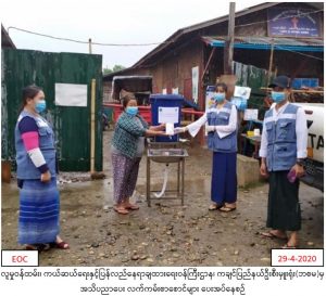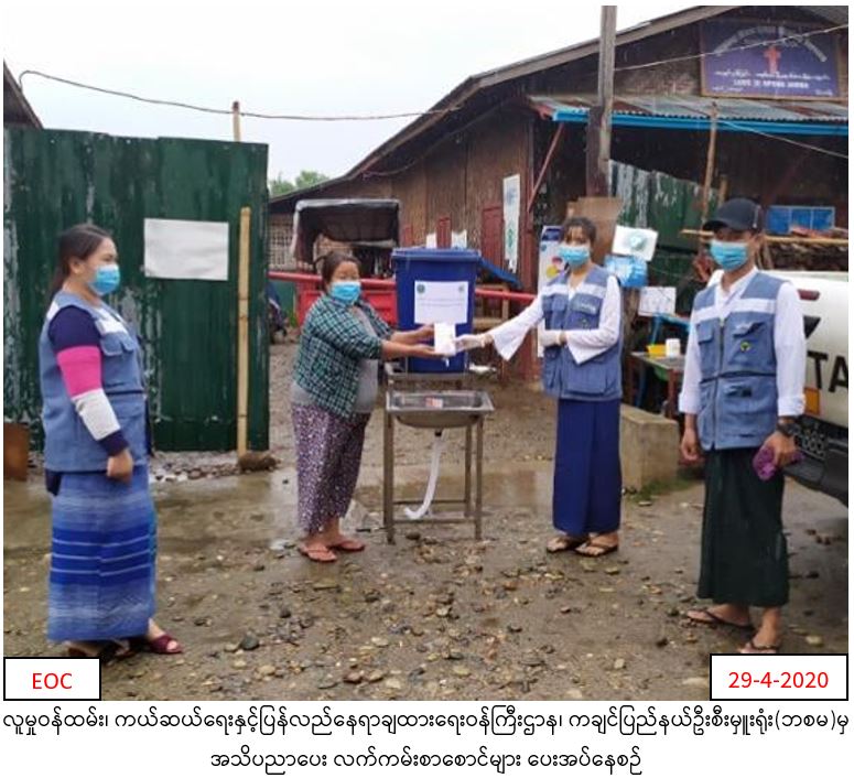လူမှုဝန်ထမ်း၊ ကယ်ဆယ်ရေးနှင့် ပြန်လည်နေရာချထားရေးဝန်ကြီးဌာန၊ ဘေးအန္တရာယ်ဆိုင်ရာစီမံခန့်ခွဲမှုဦးစီးဌာန၊ ကချင်ပြည်နယ်ဦးစီးမှူးရုံးမှ တာဝန်ရှိသူများသည် (၂၉-၄-၂၀၂၀) ရက်နေ့တွင် Covid-19 နှင့် ပတ်သက်၍ ဝိုင်းမော်မြို့နယ်ရှိ၊ လော်ဝေါ်နှစ်ခြင်းအားဘေစင်(၁)ခု၊ မြို့မနှစ်ခြင်း အားဘေစင်(၂)ခု၊ Non-Contact Infrared Thermometer (၂)ခုနှင့် Covid-19 အသိပညာပေး Flow Chart ဗီနိုင်းပိုစတာ (၂)ခု တို့ကို တစ်စခန်း(၁)ခုနှုန်းဖြင့် သွားရောက်ပေးအပ်ခဲ့ပြီး အသက်ရှူလမ်းကြောင်းဆိုင်ရာ ကူးစပ်ရောဂါ Covid-19 ကာကွယ်၊ တားဆီး၊ ထိန်းချုပ်ကုသရေးဆိုင်ရာ ပြည်သူ့ပန်ကြားချက်အသိပညာပေးမှုအား အသံချဲ့စက်ဖြင့် လှည့်လည်ဟောပြောခြင်းအား ဆောင်ရွက်ခဲ့ကြောင်း သတင်းရရှိပါသည်။