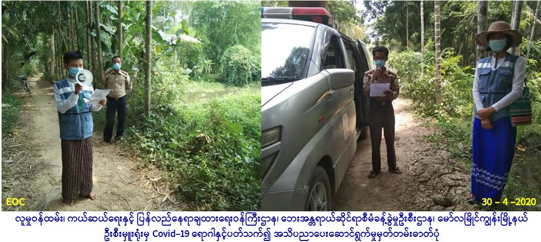 လူမှုဝန်ထမ်း၊ ကယ်ဆယ်ရေးနှင့်ပြန်လည်နေရာချထားရေးဝန်ကြီးဌာန၊ ဘေးအန္တရာယ်ဆိုင်ရာစီမံခန့်ခွဲမှုဦးစီးဌာန၊ မော်လမြိုင် ကျွန်းမြို့နယ်ဦးစီးမှူးရုံးမှ တာဝန်ရှိသူများသည် အထွေထွေအုပ်ချုပ်ရေးဦးစီးဌာန၊ မြို့နယ်ကြက်ခြေနီတပ်ဖွဲ့တို့နှင့် အတူ ပူးပေါင်း၍ (၃၀-၄-၂၀၂၀) ရက်နေ့၊ (၀၉:၀၀)နာရီအချိန်မှ (၁၂:၀၀)နာရီအချိန်ထိ မော်လမြိုင်ကျွန်းမြို့နယ်၊ ဝက်ကွင်း ကျေးရွာ အုပ်စုအတွင်းရှိ ဖူထောင်ကွေ့ကျေးရွာ၊ ဝက်ကွင်းရွာမကျေးရွာနှင့် ဝဲဒေါင့်ကျေးရွာများတွင် Covid-19 အသက်ရှူ လမ်းကြောင်း ဆိုင်ရာရောဂါနှင့်ပတ်သက်၍ ကျန်းမာရေးနှင့်အားကစားဝန်ကြီးဌာနမှ ထုတ်ပြန်ထားသည့် အသိပေးကြေညာချက်များအား အများပြည်သူများသိရှိလိုက်နာရန် ကွင်းဆင်း၍ Hand Speaker၊ Loud Speaker များဖြင့် လှည့်လှည်၍ အသိပညာပေး လုပ်ဆောင်မှုများ ပြုလုပ်ဆောင်ရွက်ခဲ့ပါကြောင်း သတင်းရရှိပါသည်။