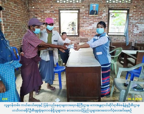 လူမှုဝန်ထမ်း၊ ကယ်ဆယ်ရေးနှင့် ပြန်လည်နေရာချထားရေးဝန်ကြီးဌာန၊ ဘေးအန္တရာယ်ဆိုင်ရာစီမံခန့်ခွဲမှုဦးစီးဌာန၊ ဟင်္သာတခရိုင်ဦးစီးမှူးရုံးမှတာဝန်ရှိသူများသည် ဟင်္သာတမြို့နယ်၊ ရိုးကြီးကျေးရွာအုပ်စု၊ ရိုးကြီး၊ ပြည်တော်သာနှင့် သောင်ကုန်းကျေးရွာတို့တွင် (၂၉-၄-၂၀၂၀) ရက်နေ့၌ ဖြစ်ပွားခဲ့သောလေဘေးကြောင့် တစ်စိတ်တစ်ပိုင်းပျက်စီးအိမ်ခြေ (ဝါးအိမ်-၃)လုံးအတွက် အိမ်ဆောက်ပစ္စည်းဖိုးထောက်ပံ့ငွေ (၉၀,၀၀ဝ/-)ကျပ်၊ လူဦးရေ (၁၅) ဦး အတွက်ဆန်ရိက္ခာ(၇)ရက်စာဖိုးထောက်ပံ့ငွေ (၃၁,၅၀ဝ/-)ကျပ်၊ စုစုပေါင်းထောက်ပံ့ငွေ (၁၂၁,၅၀ဝ/-)ကျပ်ကို တာဝန်ရှိသူများနှင့်အတူ ဘေးသင့်ပြည်သူများလက်ဝယ်သို့ (၃၀-၄-၂၀၂၀) ရက်နေ့ (၁၆:၀၀)နာရီတွင် ကွင်းဆင်းထောက်ပံ့ပေးအပ်ခဲ့ပါကြောင်း သတင်းရရှိပါသည်။