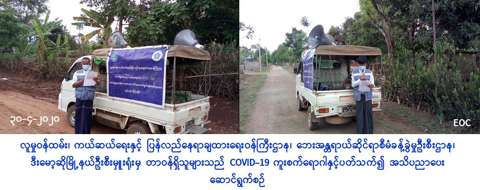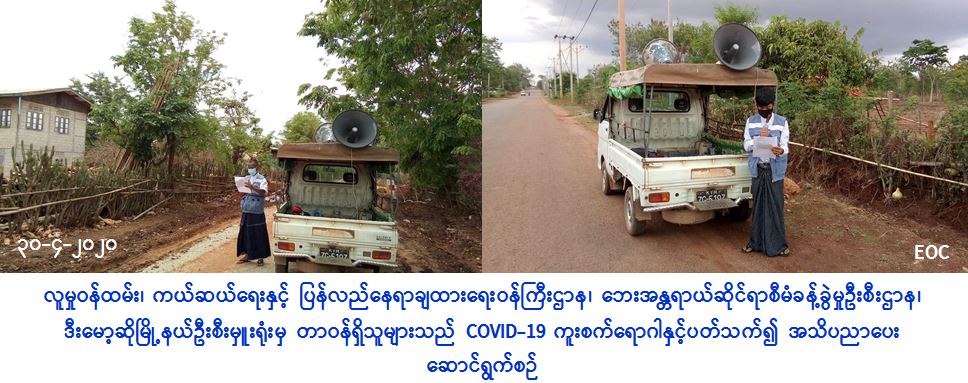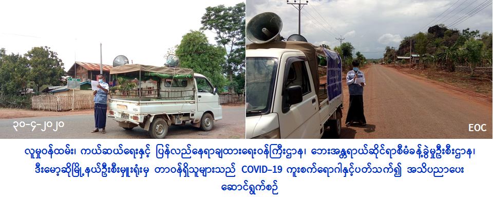 လူမှုဝန်ထမ်း၊ ကယ်ဆယ်ရေးနှင့် ပြန်လည်နေရာချထားရေးဝန်ကြီးဌာန၊ ဘေးအန္တရာယ်ဆိုင်ရာစီမံခန့်ခွဲမှုဦးစီးဌာန၊ ဒီးမော့ဆိုမြို့နယ်ဦးစီးမှူးရုံးမှ တာဝန်ရှိသူများသည် (၃၀-၄-၂၀၂၀) ရက်နေ့တွင် ဒီးမော့ဆိုမြို့နယ်၊ ဆောင်ဒူလာကျေးရွာအုပ်စု ယူဆမိုဆိုကျေးရွာနှင့် ဒေါတဝီကျေးရွာ၊ နောင်ပုလဲကျေးရွာအုပ်စု၊ လေးမိုင်မြေနီကုန်းကျေးရွာ၊ မြလဲကျေးရွာအုပ်စု၊ ဆီးမီဆိုဒါးကျေးရွာ၊ ဒေါတော်ကူးကျေးရွာအုပ်စု၊ ဒေါဆီးအီကျေးရွာများရှိ မိဘပြည်သူများအား COVID-19 ရောဂါကူးစက်ပြန့်နှံ့မှုမဖြစ်ပွားစေရေးအတွက် သိရှိလိုက်နာရန်အချက်များအား အသိပညာပေးခြင်းများ ဆောင်ရွက်ခဲ့ကြောင်း သတင်းရရှိပါသည်။