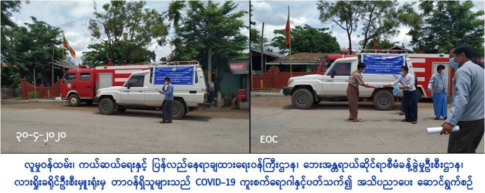 လူမှုဝန်ထမ်း၊ ကယ်ဆယ်ရေးနှင့် ပြန်လည်နေရာချထားရေးဝန်ကြီးဌာန၊ ဘေးအန္တရာယ်ဆိုင်ရာစီမံခန့်ခွဲမှုဦးစီးဌာန၊ လားရှိုးခရိုင်ဦးစီးမှူးရုံးမှ တာဝန်ရှိသူများသည် လားရှိုးခရိုင်ပြန်လည်ထူထောင်ရေးဦးစီးဌာန၊ မူးယစ်ဆေးဖြတ်ပြီးသူများပြန်လည်ထူထောင်ရေးစခန်း၊ လူမှုဝန်ထမ်းဦးစီးဌာန၊ မြို့နယ်အထွေထွေအုပ်ချုပ်ရေးဦးစီးဌာနတို့နှင့်ပူးပေါင်း၍ (၃၀-၄-၂၀၂၀) ရက်နေ့တွင် လားရှိုးမြို့နယ်၊ မိုင်းမောကျေးရွာနှင့် မန်ပန်ကျေးရွာတို့၌ COVID-19 ရောဂါကူးစက်ပျံ့နှံ့မှု မဖြစ်ပွားစေရန် သိရှိလိုက်နာဆောင်ရွက်ရမည့်အချက်များကို အသိပေးပန်ကြားခြင်းများ ဆောင်ရွက်ခဲ့ကြောင်း သတင်းရရှိပါသည်။