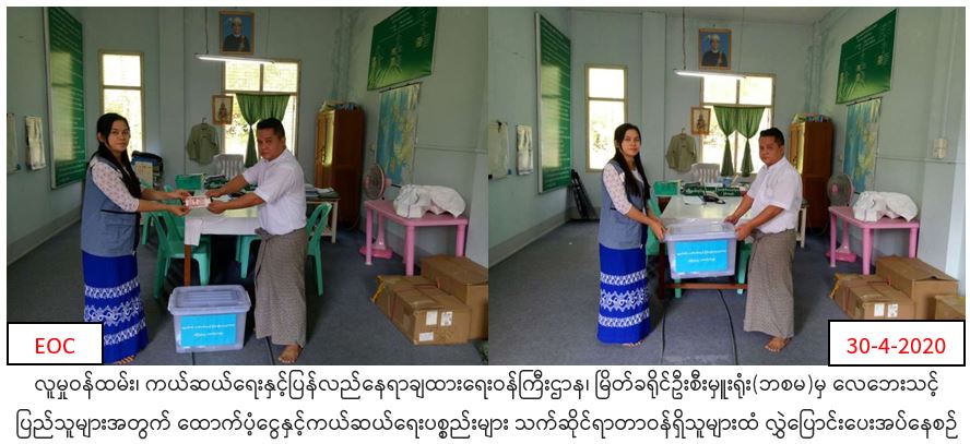 လူမှုဝန်ထမ်း၊ ကယ်ဆယ်ရေးနှင့်ပြန်လည်နေရာချထားရေးဝန်ကြီးဌာန၊ ဘေးအန္တရာယ်ဆိုင်ရာစီမံခန့်ခွဲမှုဦးစီးဌာန၊ မြိတ်ခရိုင်ဦးစီးမှူးရုံးမှ (၂၅.၄.၂၀၂၀)နေ့ ကျွန်းစုမြို့နယ်၊ ကျောက်ပိတ်ကျေးရွာတွင် လေပြင်းတိုက်ခတ်မှုကြောင့် ပြိုလဲအိမ်ခြေ(၁)လုံးအတွက် ကယ်ဆယ်ရေးပစ္စည်း (၁၆)မျိုး (၁)စုစာ၊ အိမ်ဆောက်ပစ္စည်းဖိုး (၁၀၀၀၀ဝိ/-)နှင့် လူ(၆)ဦးအတွက်ဆန်ဖိုး (၁၂၆၀ဝိ/-)၊ စုစုပေါင်း (၁၁၂၆၀ဝိ/-)အား (၃၀.၄. ၂၀၂၀)နေ့ နေ့လည်၂နာရီတွင် ကျွန်းစုမြို့နယ်၊ အထွေထွေအုပ်ချုပ်ရေးဦးစီးဌာန၌ သွားရောက်ထောက်ပံခဲ့ကြောင်း သတင်းရရှိပါသည်။