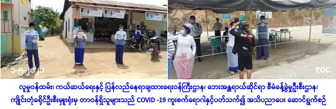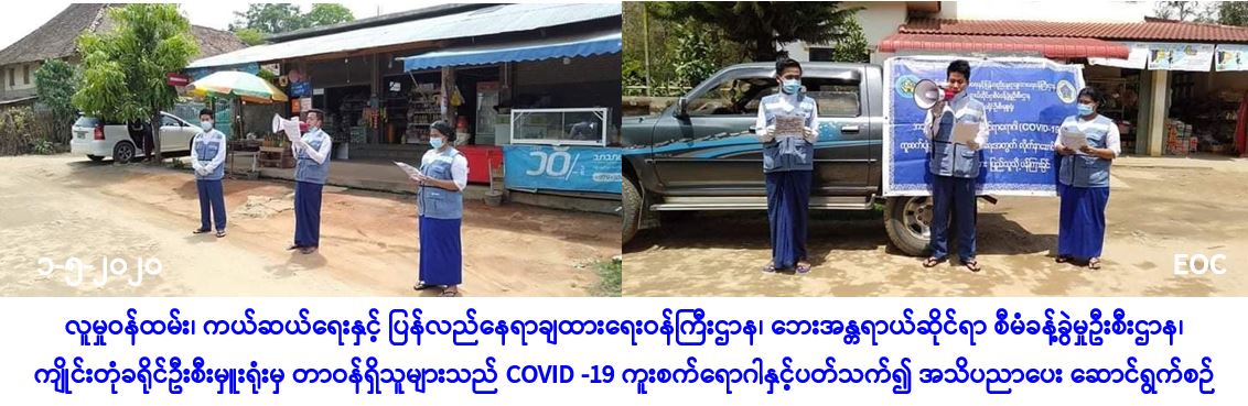 လူမှုဝန်ထမ်း၊ ကယ်ဆယ်ရေးနှင့် ပြန်လည်နေရာချထားရေးဝန်ကြီးဌာန၊ ဘေးအန္တရာယ်ဆိုင်ရာ စီမံခန့်ခွဲမှုဦးစီးဌာန၊ ကျိုင်းတုံခရိုင်ဦးစီးမှူးရုံးမှ တာဝန်ရှိသူများသည် မြို့နယ်အထွေထွေအုပ်ချုပ်ရေးဦးစီးဌာန၊ မြို့နယ်ပြည်သူ့ကျန်းမာရေးဦးစီးဌာန၊ မြို့နယ်ကြက်ခြေနီအသင်းတို့နှင့်ပူပေါင်း၍ (၁-၅-၂၀၂၀) ရက်နေ့တွင် ကျိုင်းတုံ-တာချီလိတ်၊ နောင်နွန်းစုပေါင်းဂိတ်၌ ကျိုင်းတုံမြို့တွင်းသို့ အ၀င်/အထွက်ယာဥ်လိုင်းများတွင် စီးနှင်းလိုက်ပါသောခရီးသည်များအား ကျန်းမာရေးစစ်ဆေးခြင်း၊ မှတ်တမ်းကောက်ယူခြင်းနှင့် ကျိုင်းတုံမြို့၊ ကတ်ထိုက်ကျေးရွာအုပ်စု၊ ကတ်ထိုက်ကျေးရွာနှင့် တင်ထပ်ကျေးရွာတို့တွင် COVID-19 ရောဂါ ကူးစက်ပျံ့နှံ့မှုများမဖြစ်ပွားစေရန် သိရှိလိုက်နာဆောင်ရွက်ရမည့် အချက်များကို အသိပညာပေး ဆောင်ရွက်ခဲ့ကြောင်း သတင်းရရှိပါသည်။
