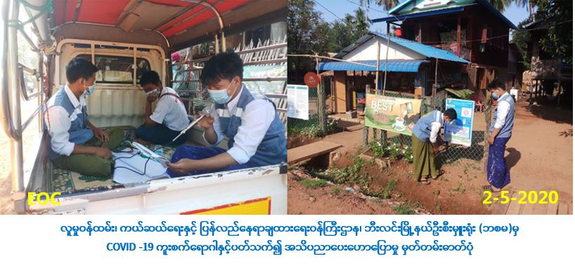 လူမှုဝန်ထမ်း၊ ကယ်ဆယ်ရေးနှင့် ပြန်လည်နေရာချထားရေးဝန်ကြီးဌာန၊ ဘေးအန္တရာယ်ဆိုင်ရာစီမံ ခန့်ခွဲမှုဦးစီးဌာန၊ မွန်ပြည်နယ်၊ သထုံခရိုင်၊ ဘီးလင်းမြို့နယ်ဦးစီးမှူးရုံးမှ တာဝန်ရှိသူများသည် (၂-၅-၂၀၂၀) ရက်နေ့၊ (၀၇:၃၀)မှ စတင်ပြီးဘီးလင်းမြို့နယ်၊ မုသင်ကျေးရွာအုပ်စုအတွင်းရှိ မုသင်ကျေးရွာ၊ သာယာကုန်းကျေးရွာ၊ ဝိုင်းပတ်ကျေးရွာနှင့် ရွာလေးကျေးရွာတို့တွင် COVID-19 ကူးစက်ရောဂါ နှင့်ပတ်သက်ပြီး ဆောင်ရန်/ ရှောင်ရန် တို့ကို ကျေးရွာအုပ်ချုပ်ရေးမှူးများနှင့်အတူ ပူးပေါင်း၍ ဆောင်ရွက်လျက်ရှိကြောင်း သတင်းရရှိပါသည်။