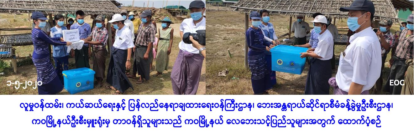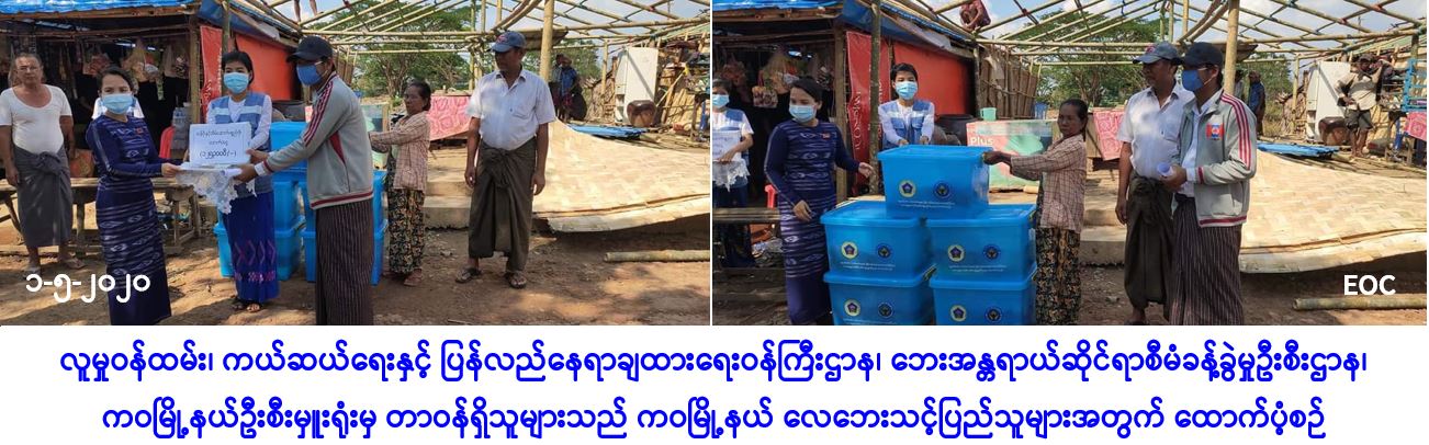 လူမှုဝန်ထမ်း၊ ကယ်ဆယ်ရေးနှင့် ပြန်လည်နေရာချထားရေးဝန်ကြီးဌာန၊ ဘေးအန္တရာယ်ဆိုင်ရာ စီမံခန့်ခွဲမှုဦးစီးဌာန၊ ကဝမြို့နယ်ဦးစီးမှူးရုံးမှ တာဝန်ရှိသူများသည် ပဲခူးတိုင်းဒေသကြီး၊ ပဲခူးခရိုင်၊ ကဝမြို့နယ်၊ ကဝရွာသစ်ရပ်ကွက်၊ အုန်းနှဲကျေးရွာအုပ်စုနှင့် အောင်ကံကျော်ကျေးရွာတို့၌ (၃၀-၄-၂၀၂၀) ရက်နေ့တွင် ဖြစ်ပွားခဲ့သော လေဘေးကြောင့် ပြိုလဲနေအိမ်(၆)လုံးနှင့် အမိုးလန်နေအိမ်(၃၅)လုံးတို့အတွက် အိမ်ဆောက်ပစ္စည်းဖိုးထောက်ပံ့ငွေ (၁၆၅၀၀၀ဝိ/-)၊ ပြိုလဲနေအိမ်(၆)လုံးရှိ လူဦးရေ(၃၃)ဦးတို့အတွက် ဆန်ရိက္ခာ(၇)ရက်စာဖိုးထောက်ပံ့ငွေ(၆၉၃၀ဝိ/-)၊ စုစုပေါင်းထောက်ပံ့ငွေ(၁၇၁၉၃၀ဝိ/-)နှင့် ပြိုလဲနေအိမ်(၆)လုံးအတွက် ကယ်ဆယ်ရေးပစ္စည်း(၁၆)မျိုးပါ (၆)အိမ်ထောင်စာတို့အား (၁-၅-၂၀၂၀) ရက်နေ့တွင် ကရင်တိုင်းရင်းသားရေးရာဝန်ကြီး၊ ကဝမြို့နယ်ပြည်သူ့လွှတ်တော်ကိုယ်စားလှယ်၊ ပဲခူးတိုင်းဒေသကြီးဘေးစီမံဦးစီးမှူးရုံးမှ တိုင်းဒေသကြီးဦးစီးမှူး၊ ကဝမြို့နယ်အထွေထွေအုပ်ချုပ်ရေးဦးစီးဌာနမှမြို့နယ်အုပ်ချုပ်ရေးမှူး၊ စိုက်ပျိုးရေးဦးစီးဌာနနှင့် ဆည်မြောင်းဦးစီးဌာနတို့မှ တာဝန်ရှိသူများ၊ သက်ဆိုင်ရာရပ်ကွက်အုပ်ချုပ်ရေးမှူးတို့နှင့်အတူ ကွင်းဆင်းထောက်ပံ့ခဲ့ကြောင်း သတင်းရရှိပါသည်။