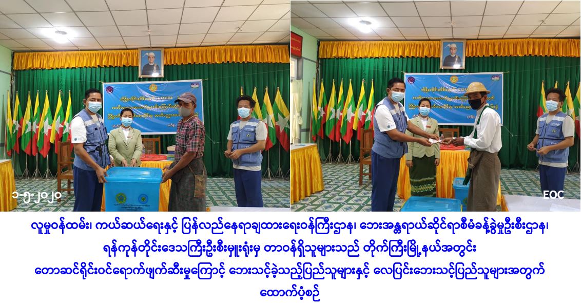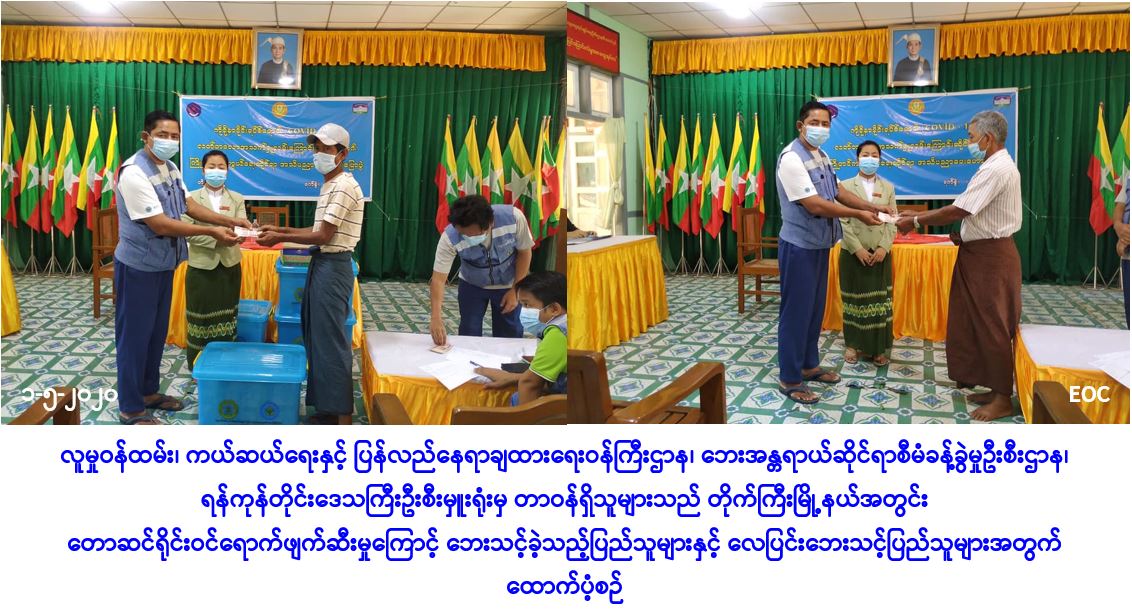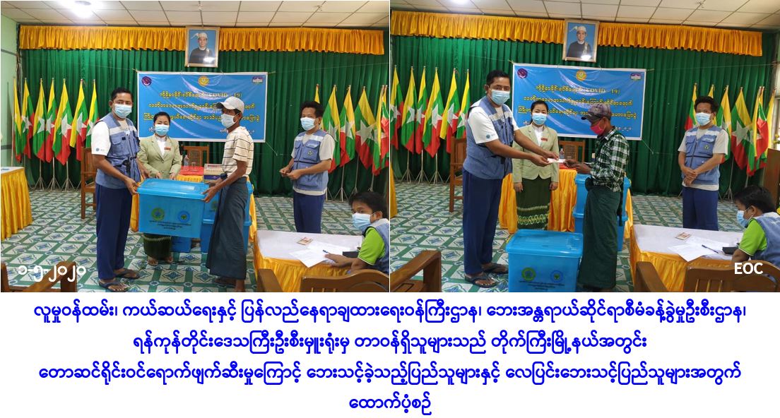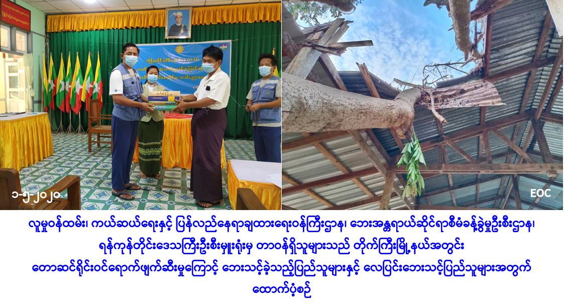 လူမှုဝန်ထမ်း၊ ကယ်ဆယ်ရေးနှင့် ပြန်လည်နေရာချထားရေးဝန်ကြီးဌာန၊ ဘေးအန္တရာယ်ဆိုင်ရာ စီမံခန့်ခွဲမှုဦးစီးဌာန၊ ရန်ကုန်တိုင်းဒေသကြီးဦးစီးမှူးရုံးမှ တာဝန်ရှိသူများသည် ရန်ကုန်တိုင်းဒေသကြီး၊ တိုက်ကြီးမြို့နယ်၊ လိမ္မော်ခြံကျေးရွာအုပ်စု၊ စမ်းရွာကျေးရွာအုပ်စုနှင့် လုံဘူတာကျေးရွာအုပ်စုတို့၌ (၂၇-၄-၂၀၂၀) ရက်နေ့တွင် တောဆင်ရိုင်းဝင်ရောက်ဖျက်ဆီးမှုကြောင့် နေအိမ်(၄)လုံး၊ အိမ်ထောင်စု(၄)စုမှ လူဦးရေ(၁၈)ဦးတို့ ဘေးသင့်ခဲ့သဖြင့် အဆိုပါနေအိမ်(၄)လုံးအတွက် အိမ်ဆောက်ပစ္စည်းဖိုးထောက်ပံ့ငွေကျပ်(၂,၀၀,၀၀ဝိ/-)၊ ဆန်ရိက္ခာဖိုးထောက်ပံ့ငွေကျပ်(၃၇,၈၀ဝိ/-)နှင့် ကယ်ဆယ်ရေးပစ္စည်း(၁၁)မျိုး (၄)အိမ်ထောင်စုစာတို့အားလည်းကောင်း၊ တိုက်ကြီးမြို့နယ်၊ လိမ္မော်ခြံကျေးရွာအုပ်စု၊ ပိုက်လုံးစုကျေးရွာ၌ (၂၇-၄-၂၀၂၀) ရက်နေ့တွင် မိုးသည်းထန်စွာရွာသွန်း၍ လေပြင်းတိုက်ခတ်မှုကြောင့် ဘုန်းတော်ကြီးကျောင်း(၁)ကျောင်း၊ သာသနိကအဆောက်အအုံ(၁)လုံး၊ လူနေအိမ်(၂)လုံး အမိုးလန်ပျက်စီးခဲ့ရာ အိမ်ထောင်စု(၂)စု၊ လူဦးရေ(၈)ဦးတို့ဘေးသင့်ခဲ့ပါသဖြင့် အိမ်/ ကျောင်းဆောက်ပစ္စည်းဖိုးထောက်ပံ့ငွေကျပ်(၂,၂၀,၀၀ဝိ/-)နှင့် ဆန်ရိက္ခာဖိုးထောက်ပံ့ငွေကျပ် (၁၆,၈၀ဝိ/-) တို့အား ဘေးသင့်ပြည်သူများထံသို့ အထွေထွေအုပ်ချုပ်ရေးဦးစီးဌာနမှ တာဝန်ရှိသူများနှင့်အတူ (၁-၅-၂၀၂၀)ရက်နေ့တွင် သွားရောက်၍ ထောက်ပံ့ပေးခဲ့ကြောင်း သတင်းရရှိပါသည်။