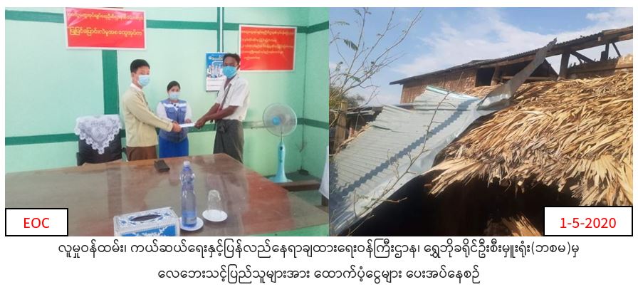 လူမှုဝန်ထမ်း၊ ကယ်ဆယ်ရေးနှင့်ပြန်လည်နေရာချထားရေးဝန်ကြီးဌာန၊ ဘေးအန္တရာယ်ဆိုင်ရာစီမံခန့်ခွဲမှုဦးစီးဌာန၊ ရွှေဘိုခရိုင်ဦးစီးမှုးရုံးမှ တာဝန်ရှိသူများသည် ဝက်လက်မြို့နယ်၊ ဆားတောင် နီကျေးရွာမှ (၃၀.၄.၂၀၂၀)ရက်နေ့တွင် လေပြင်းတိုက်ခတ်မှုကြောင့် အမိုးလန်ပျက်စီးသွားသောလူနေအိမ်(၁)လုံးအတွက် အိမ်ဆောက်ပစ္စည်းဖိုးထောက်ပံ့ငွေ (၃၀၀၀၀ိ/-)နှင့် လူဦးရေ(၅)ဦးအတွက် ဆန်ရိက္ခာဖိုးထောက်ပံ့ငွေ (၁၀၅၀၀ိ/-)၊ စုစုပေါင်းထောက်ပံ့ငွေ (၄၀၅၀၀ိ/-)တို့အား (၁.၅.၂၀၂၀)ရက်နေ့တွင် မြို့နယ်အထွေထွေအုပ်ချုပ်ရေးဦးစီးဌာနမှတစ်ဆင့် ဘေးသင့်ပြည်သူထံသို့သွားရောက် ထောက်ပံ့ပေးအပ်ခဲ့ကြောင်း သတင်းရရှိပါသည်။