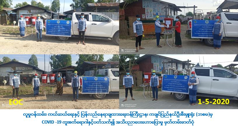 လူမှုဝန်ထမ်း၊ ကယ်ဆယ်ရေးနှင့် ပြန်လည်နေရာချထားရေးဝန်ကြီးဌာန၊ ဘေးအန္တရာယ်ဆိုင်ရာစီမံ ခန့်ခွဲမှုဦးစီးဌာန၊ ကချင်ပြည်နယ်ဦးစီးမှူးရုံးမှ တာဝန်ရှိသူများသည် (၁-၅-၂၀၂၀) ရက်နေ့တွင် Covid-19 နှင့် ပတ်သက်၍ ဝိုင်းမော်မြို့နယ်ရှိ၊ နောင်ဟီးစခန်း၊ ခတ်ချိုအလယ်ပိုင်း(ကွက်သစ်)၊ မဒိန် KBC IDPs စခန်းများသို့ လက်ဆေးဘေစင်(၄)ခု၊ Non-Contact Infrared Thermometer(၃)ခု တို့အားသွားရောက်ပေးအပ်ခဲ့ပြီး အသက်ရှူလမ်းကြောင်းဆိုင်ရာ ကူးစက်ရောဂါ Covid-19 ကာကွယ်၊ တားဆီး၊ ထိန်းချုပ်ကုသရေးဆိုင်ရာ ပြည်သူ့ပန်ကြားချက်အသိပညာပေးမှုအား အသံချဲ့စက်ဖြင့် လှည့်လည်ဟောပြောခြင်းအား ဆောင်ရွက်ခဲ့ကြောင်း သတင်းရရှိပါသည်။