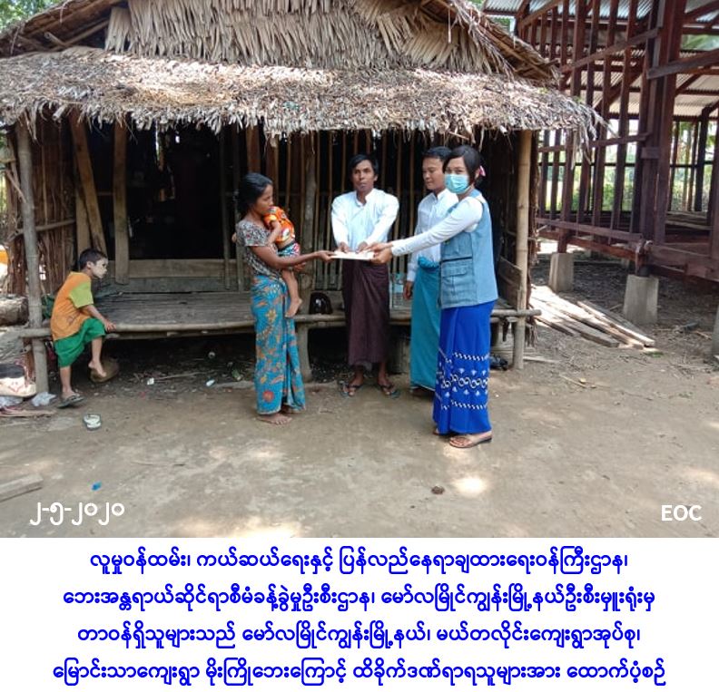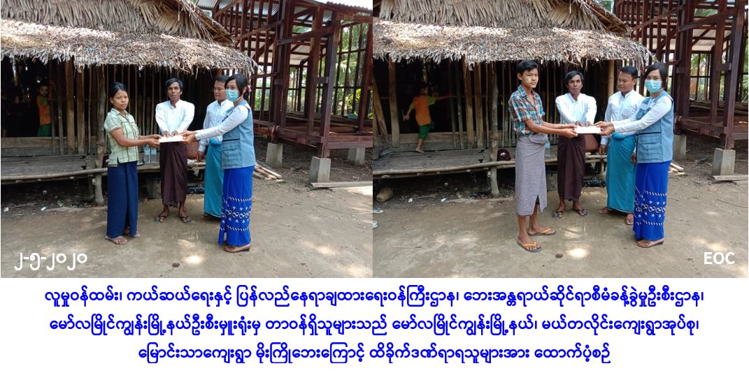 လူမှုဝန်ထမ်း၊ ကယ်ဆယ်ရေးနှင့် ပြန်လည်နေရာချထားရေးဝန်ကြီးဌာန၊ ဘေးအန္တရာယ်ဆိုင်ရာ စီမံခန့်ခွဲမှုဦးစီးဌာန၊ မော်လမြိုင်ကျွန်းမြို့နယ်ဦးစီးမှူးရုံးမှ တာဝန်ရှိသူများသည် လပွတ္တာခရိုင်၊ မော်လမြိုင်ကျွန်းမြို့နယ်၊ မယ်တလိုင်းကျေးရွာအုပ်စု၊ မြောင်းသာကျေးရွာ၌ (၃၀-၄-၂၀၂၀) ရက်နေ့တွင် ဖြစ်ပွားခဲ့သော မိုးကြိုးပစ်မှုကြောင့် ထိခိုက်ဒဏ်ရာရသူ (၃)ဦးအတွက် (၁)ဦးလျှင် (၅၀၀၀ဝိ/-)နှုန်းဖြင့် စုစုပေါင်း ထောက်ပံ့ငွေ (၁၅၀၀၀၀ိ/-)တိတိအား (၂-၅-၂၀၂၀) ရက်နေ့၊ (၁၄း၀၀) နာရီအချိန်တွင် ကျေးရွာအုပ်ချုပ်ရေးမှူး၊ ရပ်ကျေးစာရေးတို့နှင့်အတူ ထိခိုက်ဒဏ်ရာရရှိသူများထံသို့ သွားရောက်ထောက်ပံ့ပေးအပ်ခဲ့ကြောင်း သတင်းရရှိပါသည်။