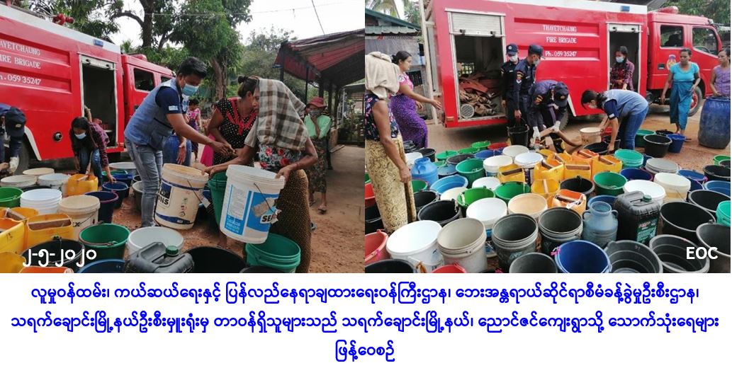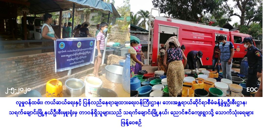 လူမှုဝန်ထမ်း၊ ကယ်ဆယ်ရေးနှင့် ပြန်လည်နေရာချထားရေးဝန်ကြီးဌာန၊ ဘေးအန္တရာယ်ဆိုင်ရာစီမံခန့်ခွဲမှုဦးစီးဌာန၊ သရက်ချောင်းမြို့နယ်ဦးစီးမှူးရုံးမှ တာဝန်ရှိသူများသည် (၂-၅-၂၀၂၀) ရက်နေ့တွင် သရက်ချောင်းမြို့နယ်၊ ညောင်ဇင်ကျေးရွာသို့ သောက်သုံးရေ(၇၂၀၀)ဂါလံအား သက်ဆိုင်ရာတာဝန်ရှိသူများနှင့်အတူ သွားရောက်ဖြန့်ဝေပေးခဲ့ကြောင်း သတင်းရရှိပါသည်။