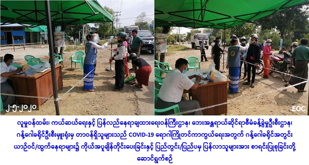လူမှုဝန်ထမ်း၊ ကယ်ဆယ်ရေးနှင့် ပြန်လည်နေရာချထားရေးဝန်ကြီးဌာန၊ ဘေးအန္တရာယ်ဆိုင်ရာ စီမံခန့်ခွဲမှုဦးစီးဌာန၊ ဂန့်ဂေါခရိုင်ဦးစီးမှူးရုံးမှ တာဝန်ရှိသူများသည် မြို့နယ်အထွေထွေအုပ်ချုပ်ရေးဦးစီးဌာနနှင့် ဌာနဆိုင်ရာများမှ တာဝန်ရှိသူများနှင့်ပူးပေါင်း၍ (၂-၅-၂၀၂၀) ရက်နေ့၊ (ဝ၈:၃၀) နာရီမှ (၁၇:၃၀) နာရီထိ COVID-19 ရောဂါကြိုတင်ကာကွယ်ရေးအတွက် ဂန့်ဂေါခရိုင်အတွင်း ယာဉ်ဝင်/ထွက်နေရာများ၌ စီးနင်းလိုက်ပါလာသော ခရီးသည်များအား ကိုယ်အပူချိန်တိုင်းပေးခြင်းနှင့် ပြည်တွင်း/ပြည်ပမှ ပြန်လာသူများအား စာရင်းပြုစုခြင်းတို့ကို ဆောင်ရွက်ခဲ့ကြောင်း သတင်းရရှိပါသည်။
