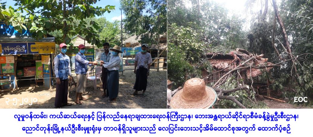 လူမှုဝန်ထမ်း၊ ကယ်ဆယ်ရေးနှင့် ပြန်လည်နေရာချထားရေးဝန်ကြီးဌာန၊ ဘေးအန္တရာယ်ဆိုင်ရာ စီမံခန့်ခွဲမှုဦးစီးဌာန၊ ညောင်တုန်းမြို့နယ်ဦးစီးမှူးရုံးမှ တာဝန်ရှိသူများသည် ညောင်တုန်းမြို့နယ်၊ ပေစိကျေးရွာ၊ လင်းဝန်ကျေးရွာ၌ (၂-၅-၂၀၂၀) ရက်နေ့တွင် ဖြစ်ပွားခဲ့သော လေဘေးကြောင့် တစ်စိတ် တစ်ပိုင်းပျက်စီးခဲ့သည့်နေအိမ် (၁) လုံး၊ အိမ်ထောင်စု (၁) စုမှ လူဦးရေ (၅) ဦးအတွက် ဆန်ရိက္ခာ၇ရက်စာ (၁၀၅၀ဝိ/-)၊ အိမ်ဆောက်ပစ္စည်းဖိုးရန်ပုံငွေ (၅၀၀၀ဝိ/-)၊ စုစုပေါင်းရန်ပုံငွေ (၆၀၅၀ဝိ\-) အား (၃-၅-၂၀၂၀) ရက်နေ့၊ (၁၀း၀၀) နာရီအချိန်တွင် လေဘေးသင့်ပြည်သူများလက်ဝယ်သို့အရောက် ကွင်းဆင်း ထောက်ပံ့ပေးအပ်ခဲ့ကြောင်း သတင်းရရှိပါသည်။