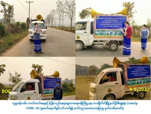 လူမှုဝန်ထမ်း၊ ကယ်ဆယ်ရေးနှင့် ပြန်လည်နေရာချထားရေးဝန်ကြီးဌာန၊ ဘေးအန္တရာယ်ဆိုင်ရာစီမံ ခန့်ခွဲမှုဦးစီးဌာန၊ တာချီလိတ်မြို့နယ်ဦးစီးမှူးရုံးမှ တာဝန်ရှိသူများသည် (၃-၅-၂၀၂၀) ရက်နေ့တွင် တာချီ လိတ်မြို့၊ ဟောင်လိတ်ကျေးရွာအုပ်စု၊ ပန်နယ်ကျေးရွာ၊ ကာနကျေးရွာ၌Covid-19 ရောဂါကူး စက်ပျံ့နှံ့မှုမဖြစ်ပွားစေရန် သိရှိလိုက်နာဆောင်ရွက်ရမည့်အချက်များကို ရှမ်းဘာသာ၊ မြန်မာဘာသာဖြင့် လှည့်လည်နှိုးဆော်ခဲ့ပြီး အသိပညာပေးလုပ်ငန်းများဆောင်ရွက်ခဲ့ကြောင်း သတင်းရရှိပါသည်။