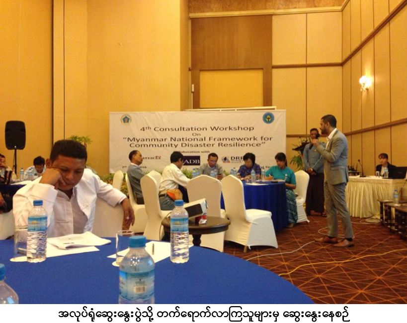 လူမှုဝန်ထမ်း၊ ကယ်ဆယ်ရေးနှင့်ပြန်လည်နေရာချထားရေးဝန်ကြီးဌာန၊ ကယ်ဆယ်ရေးနှင့်ပြန်လည် နေရာချထားရေးဦးစီးဌာနနှင့် အာရှဖွံ့ဖြိုးရေးဘဏ်၊ သဘာဝဘေးလျော့ပါးရေးလုပ်ငန်းအဖွဲ့တို့ပူးပေါင်း၍ “မြန်မာနိုင်ငံ ပြည်သူလူထု သဘာဝဘေးရင်ဆိုင်တုံ့ပြန်နိုင်စွမ်း မြင့်မားစေရေး အမျိုးသားအဆင့်မူဘောင်” ရေးဆွဲခြင်းဆိုင်ရာ စတုတ္ထအကြိမ် အလုပ်ရုံဆွေးနွေးပွဲကို Max Myanmar Hotel တွင် (၇-၇-၂၀၁၆) ရက်နေ့၊ နံနက် (၀၉း ၃၀) နာရီအချိန်တွင် ကျင်းပပြုလုပ်ခဲ့ပါသည်။ အဆိုပါ အလုပ်ရုံဆွေးနွေးပွဲသို့ လူမှုဝန်ထမ်း၊ ကယ်ဆယ်ရေးနှင့် ပြန်လည်နေရာချထားရေးဝန်ကြီးဌာန၊ ကယ်ဆယ်ရေးနှင့်ပြန်လည်နေရာချထားရေးဦးစီး ဌာနမှ တာဝန်ရှိသူများ၊ ဌာနဆိုင်ရာများမှ တာဝန်ရှိသူများနှင့် သဘာဝဘေးလျော့ပါးရေးလုပ်ငန်းအဖွဲ့များ အပါအဝင် စုစုပေါင်း (၅၇) ဦးတက်ရောက်ခဲ့ပါသည်။