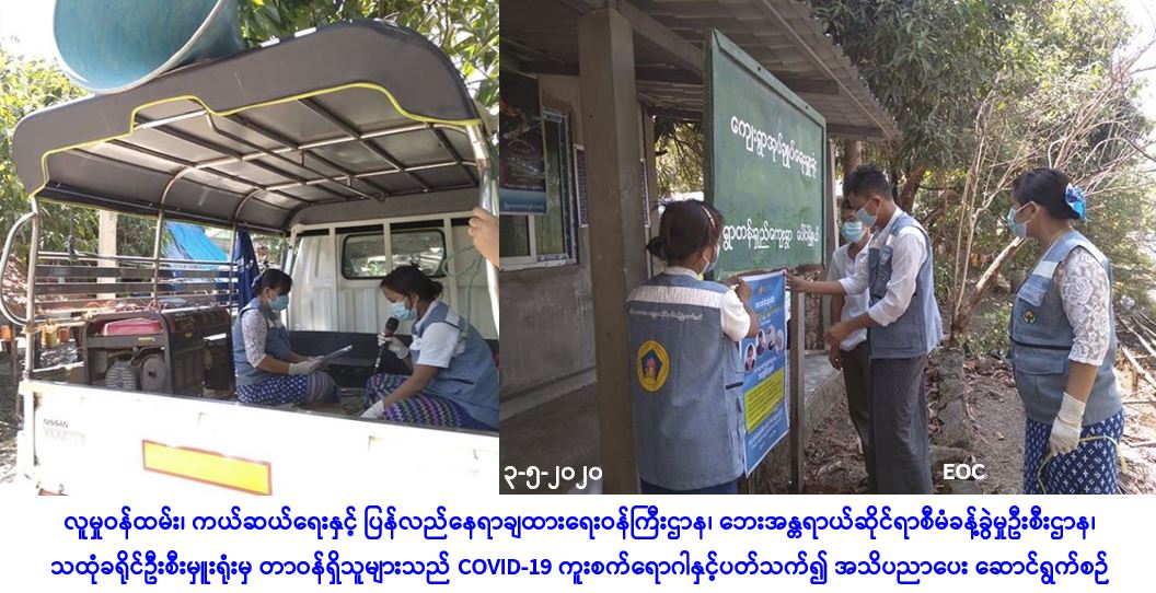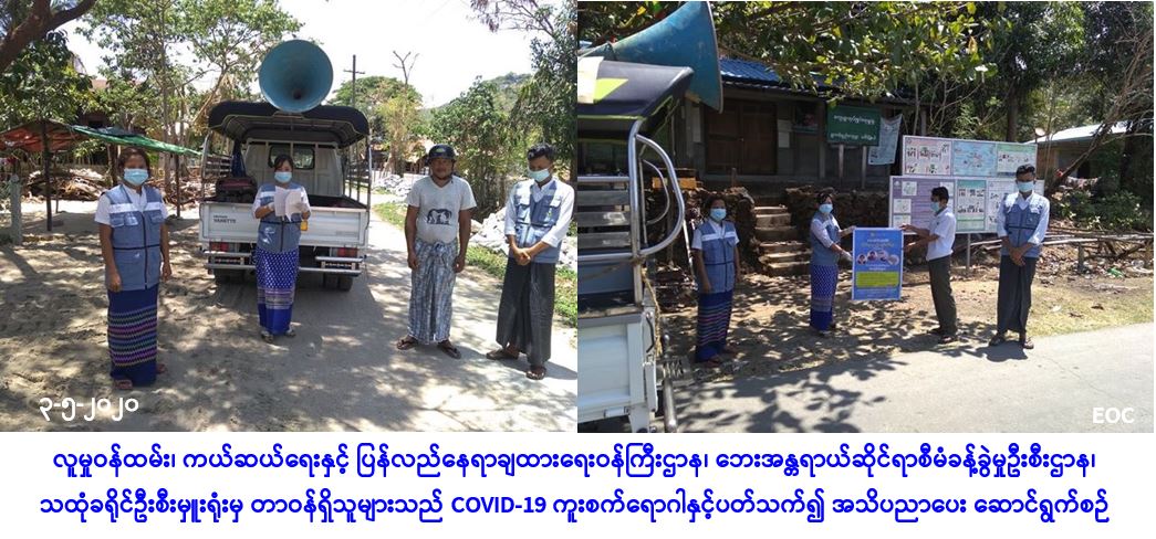 လူမှုဝန်ထမ်း၊ ကယ်ဆယ်ရေးနှင့် ပြန်လည်နေရာချထားရေးဝန်ကြီးဌာန၊ ဘေးအန္တရာယ်ဆိုင်ရာ စီမံခန့်ခွဲမှုဦးစီးဌာန၊ သထုံခရိုင်ဦးစီးမှူးရုံးမှ တာဝန်ရှိသူများသည် (၃-၅-၂၀၂၀) ရက်နေ့၊ (၀၉:၃၀) နာရီအချိန်မှ (၁၃:၃၀) နာရီအချိန်ထိ မွန်ပြည်နယ်၊ သထုံခရိုင်၊ ပေါင်မြို့နယ်၊ ရွာတန်းရှည်ကျေးရွာနှင့် ဖြူဘကျေးရွာတို့တွင် COVID-19 ကူးစက်ရောဂါနှင့်ပတ်သက်၍ အသိပညာပေးခြင်းနှင့် ဗီနိုင်းပိုစတာကပ်ခြင်းတို့ ဆောင်ရွက်ခဲ့ကြောင်း သတင်းရရှိပါသည်။