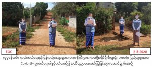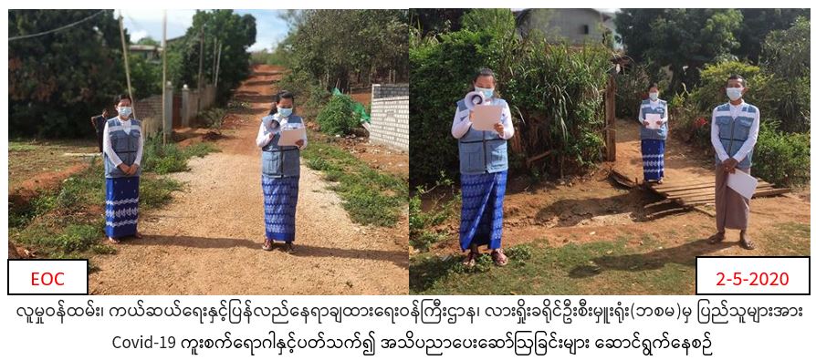 လူမှုဝန်ထမ်း၊ ကယ်ဆယ်ရေးနှင့်ပြန်လည်နေရာချထားရေးဝန်ကြီးဌာန၊ ဘေးအန္တရာယ်ဆိုင်ရာစီမံခန့်ခွဲမှုဦးစီးဌာန၊ လားရှိုးခရိုင်ဦးစီးမှူးရုံးမှ တာဝန်ရှိသူများသည် လားရှိုးခရိုင်ပြန်လည်ထူထောင်ရေးဦးစီးဌာန၊ မူးယစ်ဆေးဖြတ်ပြီးသူများပြန်လည်ထူထောင်ရေးစခန်း၊ လူမှုဝန်ထမ်းဦးစီးဌာန၊ မြို့နယ်အထွေထွေအုပ်ချုပ်ရေးဦးစီးဌာနတို့နှင့်ပူးပေါင်း၍ (၂-၅-၂၀၂၀) ရက်နေ့တွင် လားရှိုးမြို့ နယ် ခါးရှိကျေးရွာ၊ မိုင်းမောကျေးရွာတို့၌ COVID-19 ရောဂါကူးစက်ပျံ့နှံ့မှု မဖြစ်ပွားစေရန် သိရှိလိုက်နာ ဆောင်ရွက်ရမည့်အချက်များကို အသိပေးပန်ကြားခြင်းများကိုဆောင်ရွက်ခဲ့ကြောင်း သတင်းရရှိပါသည်။