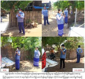 လူမှုဝန်ထမ်း၊ ကယ်ဆယ်ရေးနှင့်ပြန်လည်နေရာချထားရေးဝန်ကြီးဌာန၊ ဘေးအန္တရာယ်ဆိုင်ရာစီမံခန့်ခွဲမှုဦးစီးဌာန၊ ပြည်ထောင်စုနယ်မြေ၊ နေပြည်တော်တိုင်းဦးစီးမှူးရုံးမှ တာဝန်ရှိသူများသည် (၃-၅-၂၀၂၀) ရက်နေ့ (၁၀:၀၀) အချိန်မှ (၁၅:၀၀) အချိန်အထိ လယ်ဝေးမြို့နယ်၊ ရေကာကျေးရွာအုပ်စု၊ ရေကာကျေးရွာ၊ ရှမ်းရွာကျေးရွာ၊ ဇီးဖြူတန်းကျေးရွာ၊ ဘိုကတော်ကျေးရွာ၊ သဖန်းပင်ကျေးရွာနှင့် ဗွက်ကြီးရိုးကျေးရွာများအတွင်းရှိ ပြည်သူများအား COVID-19 ရောဂါကူးစက်ပြန့်နှံ့မှုများ မဖြစ်ပွားစေရန်အတွက် သိရှိလိုက်နာဆောင်ရွက်ရမည့်အချက်များနှင့်ပတ်သက်၍ အသိပညာပေးဆော်ဩမှုများ ဆောင်ရွက်ခဲ့ကြောင်း သတင်းရရှိပါသည်။