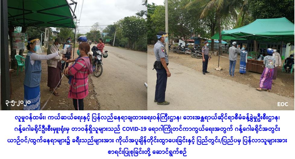 လူမှုဝန်ထမ်း၊ ကယ်ဆယ်ရေးနှင့် ပြန်လည်နေရာချထားရေးဝန်ကြီးဌာန၊ ဘေးအန္တရာယ်ဆိုင်ရာ စီမံခန့်ခွဲမှုဦးစီးဌာန၊ ဂန့်ဂေါခရိုင်ဦးစီးမှူးရုံးမှ တာဝန်ရှိသူများသည် မြို့နယ်အထွေထွေအုပ်ချုပ်ရေးဦးစီးဌာန၊ ဌာနဆိုင်ရာများမှ တာဝန်ရှိသူများနှင့်ပူးပေါင်း၍ (၃-၅-၂၀၂၀)ရက်နေ့၊ (ဝ၈:၃၀) နာရီမှ (၁၇:၃၀) နာရီအချိန်ထိ COVID-19 ရောဂါကြိုတင်ကာကွယ်ရေးအတွက် ဂန့်ဂေါခရိုင်အတွင်း ယာဉ်ဝင်/ထွက်နေရာများ၌ ယာဉ်ဖြင့် စီးနင်းလိုက်ပါလာသော ခရီးသည်များအား ကိုယ်အပူချိန်တိုင်းထွာပေးခြင်းနှင့် ပြည်တွင်း/ပြည်ပမှ ပြန်လာသူများအား စာရင်းပြုစုခြင်းတို့ကို ဆောင်ရွက်ခဲ့ကြောင်း သတင်းရရှိပါသည်။