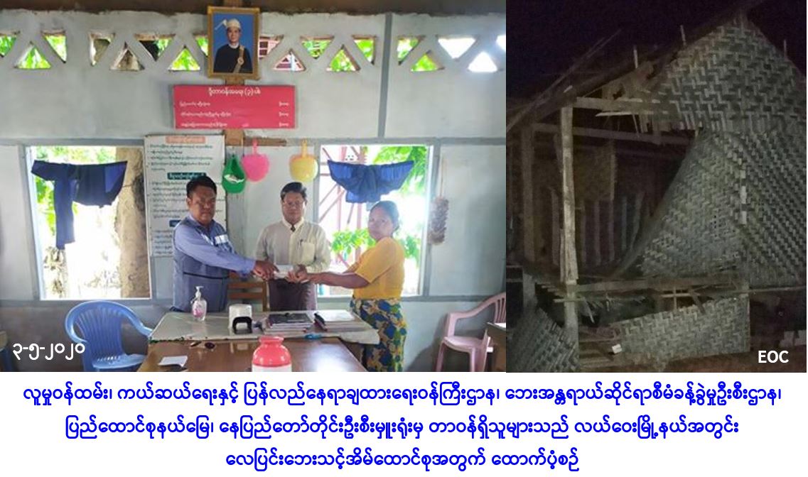 လူမှုဝန်ထမ်း၊ ကယ်ဆယ်ရေးနှင့် ပြန်လည်နေရာချထားရေးဝန်ကြီးဌာန၊ ဘေးအန္တရာယ်ဆိုင်ရာ စီမံခန့်ခွဲမှုဦးစီးဌာန၊ ပြည်ထောင်စုနယ်မြေ၊ နေပြည်တော်တိုင်းဦးစီးမှူးရုံးမှ တာဝန်ရှိသူများသည် ပြည်ထောင်စုနယ်မြေ၊ နေပြည်တော်၊ ဒက္ခိဏခရိုင်၊ လယ်ဝေးမြို့နယ်၊ သပြေပင်အုပ်စု၊ ငွေတောင်ကျေးရွာ၌ (၂-၅-၂၀၂၀) ရက်နေ့တွင် ဖြစ်ပွားခဲ့သော လေပြင်းတိုက်ခတ်မှုကြောင့် ဘေးသင့်ခဲ့သည့် နေအိမ် (၁) လုံးအတွက် အိမ်ဆောက်ပစ္စည်းထောက်ပံ့ငွေ (၅၀၀၀ဝိ/-)၊ ဘေးသင့်လူဦးရေ (၈) ဦးအတွက် ဆန်ရိက္ခာဖိုးထောက်ပံငွေ(၁၆၈၀ဝိ/-)၊ စုစုပေါင်းထောက်ပံ့ရန်ပုံငွေ (၆၆၈၀ဝိ/-) တိတိအား (၃-၅-၂၀၂၀) ရက်နေ့၊ (၁၅:၅၀) နာရီအချိန်တွင် ဘေးသင့်ပြည်သူများလက်ဝယ်သို့ သွားရောက်ထောက်ပံ့ခဲ့ကြောင်း သတင်းရရှိပါသည်။