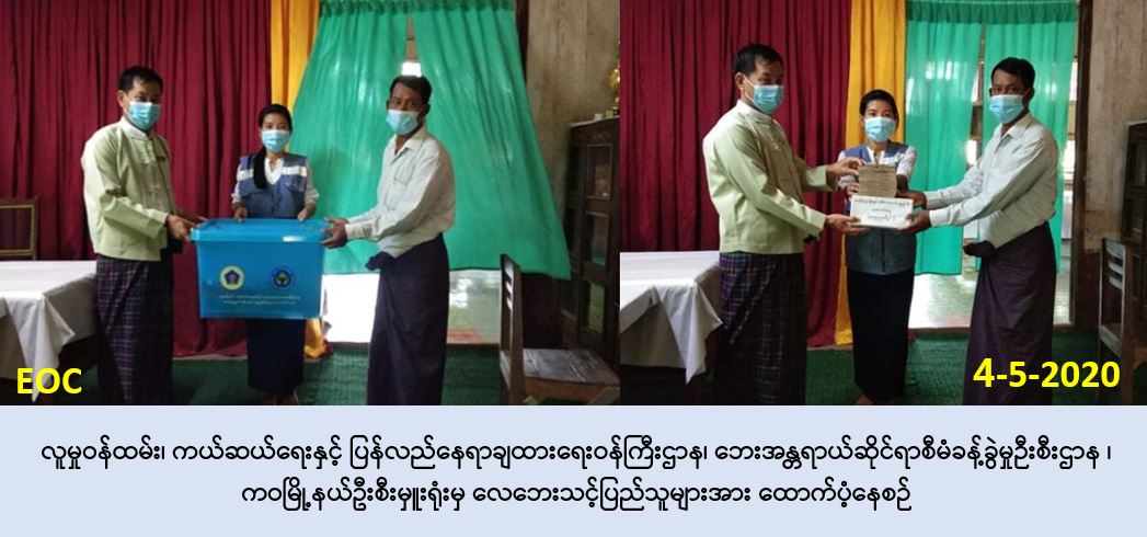 လူမှုဝန်ထမ်း၊ ကယ်ဆယ်ရေးနှင့် ပြန်လည်နေရာချထားရေးဝန်ကြီးဌာန၊ ဘေးအန္တရာယ်ဆိုင်ရာ စီမံခန့်ခွဲမှုဦးစီးဌာန၊ ကဝမြို့နယ်ဦးစီးမှူးရုံးမှ တာဝန်ရှိသူများသည် (၃-၅-၂၀၂၀) ရက်နေတွင် ပဲခူးတိုင်းဒေသကြီး၊ ပဲခူးခရိုင်၊ ကဝမြို့နယ်၊ ဇီးဖြူကုန်းကျေးရွာနှင့် ကမာဘာကျေးရွာတို့တွင် ဖြစ်ပွားခဲ့သော လေဘေးမှ လေဘေးသင့်ပြိုလဲနေအိမ် (၃) လုံး၊ အမိုးလန်နေအိမ် (၁၉) လုံးတို့ အတွက် အိမ်ဆောက်ပစ္စည်းဖိုးထောက်ပံ့ငွေ (၈၇၀၀၀ဝိ/-)ကျပ်၊ ပြိုလဲနေအိမ် (၃) လုံးရှိ လူဦးရေ (၇) ဦး တို့အတွက် ဆန်ရိက္ခာ (၇) ရက်စာဖိုး ထောက်ပံ့ငွေ(၁၄၇၀ဝိ/-)ကျပ်၊ စုစုပေါင်းထောက်ပံ့ ငွေ (၈၈၄၇၀ဝိ/-)ကျပ်နှင့် ပြိုလဲနေအိမ် (၃) လုံး အတွက် ကယ်ဆယ်ရေးပစ္စည်း (၁၆) မျိုးပါ (၃) အိမ်ထောင်စာတို့အား (၄-၅-၂၀၂၀) ရက်နေ့တွင် သွားရောက်ထောက်ပံ့ခဲ့ကြောင်း သတင်းရရှိ ပါသည်။