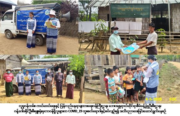 လူမှုဝန်ထမ်း၊ ကယ်ဆယ်ရေးနှင့် ပြန်လည်နေရာချထားရေးဝန်ကြီးဌာန၊ ဘေးအန္တရာယ်ဆိုင်ရာစီမံခန့်ခွဲမှုဉီးစီးဌာန၊ ဂန့်ဂေါခရိုင်ဦးစီးမှူးရုံးမှတာဝန်ရှိသူများသည် (၄-၅-၂၀၂၀) ရက်နေ့၊ (၀၈:၃၀)နာရီအချိန်မှ (၁၆:၀၀)နာရီအချိန်အထိ မာဃသဟာယလူမှုအထောက်အကူပြုအဖွဲ့တို့နှင့်ပူးပေါင်း၍ ဂန့်ဂေါခရိုင်၊ ဂန့်ဂေါမြို့နယ်၊ ရွာသာကျေးရွာ၊ ၀က်ချီပါကျေးရွာ၊ တောဖို့ကျေးရွာနှင့် လီလင်းကျေးရွာတို့၌ COVID-19 ကူးစက်ရောဂါနှင့်စပ်လျဉ်း၍ ကာကွယ်၊ တားဆီး၊ ထိန်းချုပ်၊ ကုသရေးဆိုင်ရာ ပြည်သူလူထုအသိပညာပေးပန်ကြားချက်များကို လှည့်လည်အသိပညာပေးနှိုးဆော်ခဲ့ပါကြောင်း သတင်းရရှိပါသည်။