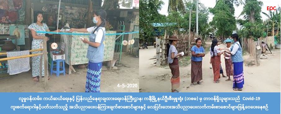 လူမှုဝန်ထမ်း၊ ကယ်ဆယ်ရေးနှင့် ပြန်လည်နေရာချထားရေးဝန်ကြီးဌာန၊ ဘေးအန္တရာယ်ဆိုင်ရာ စီမံခန့်ခွဲမှု ဦးစီးဌာန၊ ကနီမြို့နယ်ဦးစီးမှူးရုံးမှ တာဝန်ရှိသူများသည် (၄-၅-၂၀၂၀) ရက်နေ့တွင် (၉:၀၀)အချိန်မှ ( ၁၆: ၀၀) အချိန်ထိ ကနီမြို့နယ်အတွင်းရှိ ထနောင်းပကား(တ)ကျေးရွာ၊ ထနောင်းပကား(မ)ကျေးရွာ၊ ထောက်ကြံ့အိုင်ကျေးရွာ၊ ချောင်းကွေ့ကျေးရွာများအတွင်း အသံချဲ့စက်ဖြင့် လှည့်လည်၍ Covid-19 ကာကွယ်ထိန်းချုပ်ရေးဆိုင်ရာ ကျန်းမာရေးအသိပညာပေးလိုက်နာရန်အချက်များအား ပြန်ကြားရေးနှင့် ပြည်သူ့ဆက်ဆံရေးဦးစီးဌာန၊ ကျေးရွာအုပ်ချုပ်ရေးမှူးများနှင့်အတူ အသိပညာပေးဟောပြော ဆွေးနွေးခဲ့ ပါကြောင်းနှင့် ကျေးရွာများအတွင်း ပြည်သူသို့ပန်ကြားချက်များ၊ လေပြင်းဘေးလက်ကမ်းစာစောင်များ ကို ဖြန့်ဝေပေးခဲ့ကြောင်း သိရှိရပါသည်။