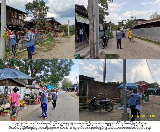 လူမှုဝန်ထမ်း၊ ကယ်ဆယ်ရေးနှင့် ပြန်လည်နေရာချထားရေးဝန်ကြီးဌာန၊ ဘေးအန္တရာယ်ဆိုင်ရာစီမံခန့်ခွဲမှုဦးစီး ဌာန၊ မိုးညှင်းခရိုင်ဦးစီးမှူးရုံးမှတာဝန်ရှိသူများသည် (၄-၅-၂၀၂၀) ရက်နေ့၊ (၁၄:၃၀) နာရီအချိန်တွင် မိုးညှင်းမြို့နယ်၊ ဟိုပင်မြို့ပေါ်ရပ်ကွက်များနှင့် မိုးကောင်းမြို့နယ်၊ နန့်ခွင်ကျေးရွာတို၌ COVID-19 ကူးစက်ရောဂါနှင့်စပ်လျဉ်း၍ ဆောင်ရန်/ရှောင်ရန်အချက်များ၊ လိုက်နာရမည့်အချက်များကို အသိပညာပေးနှိုးဆော်ခဲ့ပြီး အသိပညာပေးစာစောင်ကပ်ခြင်းတို့ ဆောင်ရွက်ခဲ့ပါကြောင်း သတင်းရရှိပါသည်။