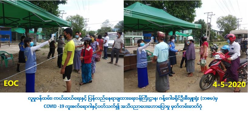 လူမှုဝန်ထမ်း၊ ကယ်ဆယ်ရေးနှင့် ပြန်လည်နေရာချထားရေးဝန်ကြီးဌာန၊ ဘေးအန္တရာယ်ဆိုင်ရာစီမံ ခန့်မှုဦးစီးဌာန၊ ဂန့်ဂေါခရိုင်ဦးစီးမှူးရုံးမှ တာဝန်ရှိသူများသည် (၄-၅-၂၀၂၀) ရက်နေ့၊ (၀၈း၃၀) နာရီ အချိန်မှ (၁ရး၃၀)နာရီအချိန်ထိ လတ်တလော နိုင်ငံအသီးသီးတွင် ကူးစက်ပြန့်ပွားလျက်ရှိသော Covid-19 ကူးစက်ရောဂါ ကြိုတင်ကာကွယ်ရေးအတွက် ဂန့်ဂေါခရိုင်အတွင်း ယာဉ်အဝင်/အထွက် စီးနင်းလိုက်ပါ လာသော ခရီးသည်များအား ကိုယ်အပူချိန်များတိုင်းထွာပေးခြင်းနှင့် ပြည်တွင်းပြည်ပမှ ပြန်လာသူများ အား စာရင်းပြုစုခြင်းတို့ကို ခရိုင်အုပ်ချုပ်ရေးမှူး၊ မြို့နယ်အုပ်ချုပ်ရေးမှူး၊ ဌာနဆိုင်ရာအသီးသီးမှ တာဝန်ရှိသူများနှင့်အတူ ပူးပေါင်းပါဝင် ဆောင်ရွက်လျက်ရှိပါကြောင်း သတင်းရရှိပါသည်။