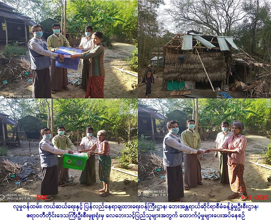 လူမှုဝန်ထမ်း၊ ကယ်ဆယ်ရေးနှင့်ပြန်လည်နေရာချထားရေးဝန်ကြီးဌာန၊ ဘေးအန္တရာယ်ဆိုင်ရာစီမံခန့်ခွဲမှုဦးစီးဌာန၊ ဧရာဝတီ တိုင်းဒေသကြီးဦးစီးမှူးရုံးမှ တာဝန်ရှိသူများသည် ပုသိမ်ခရိုင်၊ ကျောင်းကုန်းမြို့နယ်၊ ရေဂလုတ်ကျေးရွာအုပ်စု၊ ပေါက်ငူကျေးရွာ တွင် (၃-၅-၂၀၂၀) ရက်နေ့၌ ဖြစ်ပွားခဲ့သော လေဘေးကြောင့် ပြိုကျပျက်စီးခဲ့သည့် နေအိမ် (၂)လုံး၊ အမိုးလန်ပျက်စီးနေအိမ် (၃)လုံး၊ စုစုပေါင်း နေအိမ် (၅)လုံး၊ အိမ်ထောင်စု (၅)စုမှ လူဥရေ (၁၀) ဦးအတွက် ကယ်ဆယ်ရေးပစ္စည်း (၁၇)မျိုး (၂)ပုံး (၆၄၇၀၆/-)ကျပ်၊ အိမ်ဆောက်ပစ္စည်းဖိုး (၃၅၀၀၀ဝ/-)ကျပ်၊ ဆန်ရိက္ခာ(၇)ရက်စာ ရန်ပုံငွေ (၂၁၀၀ဝ/-)ကျပ်၊ စုစုပေါင်း ရန်ပုံငွေ (၃၇၁၀၀ဝ/-)ကျပ်အား (၄-၅-၂၀၂၀)ရက်နေ့ (၁၆:၃၀)နာရီအချိန်တွင် သက်ဆိုင်ရာတာဝန်ရှိသူများနှင့်အတူ လေဘေးသင့် ပြည်သူများလက်ဝယ်အရောက် ကွင်းဆင်းထောက်ပံ့ပေးအပ်ခဲ့ပါကြောင်း သတင်းရရှိပါသည်။