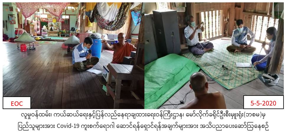လူမှုဝန်ထမ်း၊ ကယ်ဆယ်ရေးနှင့်ပြန်လည်နေရာချထားရေးဝန်ကြီးဌာန၊ ဘေးအန္တရာယ်ဆိုင်ရာစီမံခန့်ခွဲမှုဦးစီးဌာန၊ မော်လိုက်ခရိုင်ဦးစီးမှူးရုံးမှ တာဝန်ရှိသူများသည် ကျေးရွာအုပ်ချုပ်ရေးမှူးများ၊ ရပ်မိ၊ရပ်ဖများနှင့်အတူ (၅-၅-၂၀၂၀) ရက်နေ့တွင် စစ်ကိုင်းတိုင်းဒေသကြီး၊ မော်လိုက်မြို့နယ်အတွင်းရှိ နန်းတိုင်းသာကျေးရွာ၊ ထော်သာကျေးရွာများတွင် Covid-19 ရောဂါကူးစက်ပျံ့နှံ့မှုများမဖြစ်ပွားစေနိုင်ရန်အတွက် အများပြည်သူများ အလွယ်တကူသိရှိ လိုက်နာဆောင်ရွက်ရန်များကို အသိပေးဆော်ဩမှုများ ဆောင်ရွက်ခဲ့ကြောင်း သတင်းရရှိပါသည်။