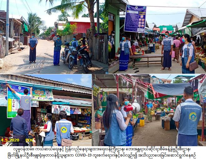 လူမှုဝန်ထမ်း၊ ကယ်ဆယ်ရေးနှင့် ပြန်လည်နေရာချထားရေးဝန်ကြီးဌာန၊ ဘေးအန္တရာယ်ဆိုင်ရာစီမံခန့်ခွဲမှုဦးစီး ဌာန၊ မြိတ်မြို့နယ်ဦးစီးမှူးရုံးမှတာဝန်ရှိသူများသည် (၄-၅-၂၀၂၀) ရက်နေ့တွင် မြိတ်မြို့နယ်၊ ပါရမီရပ်ကွက်၊ ပါရမီဈေးနှင့် မြို့သစ်ဈေး၌ COVID-19 ကူးစက်ရောဂါနှင့်စပ်လျဉ်း၍ ဆောင်ရန်/ရှောင်ရန်အချက်များ အသိပညာပေးနှိုးဆော်ခြင်းနှင့် ဗီနိုင်းပိုစတာကပ်ခြင်းတို့ကို ရပ်/ကျေးအဖွဲ့နှင့်ပူးပေါင်း၍ ဆောင်ရွက်ခဲ့ပါကြောင်း သတင်းရရှိပါသည်။