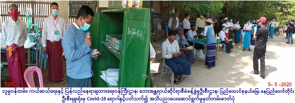 လူမှုဝန်ထမ်း၊ ကယ်ဆယ်ရေးနှင့် ပြန်လည်နေရာချထားရေးဝန်ကြီးဌာန၊ ဘေးအန္တရာယ်ဆိုင်ရာစီမံခန့်ခွဲမှုဉီးစီးဌာန၊ ပြည်ထောင်စုနယ်မြေ၊ နေပြည်တော်တိုင်းဦးစီးမှူးရုံးမှ တာဝန်ရှိသူများသည် (၅-၅-၂၀၂၀) ရက်နေ့ (၁၀:၀၀) အချိန်မှ (၁၅:၀၀) အချိန်အထိ ပြည်သူများအား COVID-19 ရောဂါကူးစက်ပြန့်နှံ့မှုများ မဖြစ်ပွားစေရန်အတွက် သိရှိလိုက်နာဆောင်ရွက်ရမည့် အချက်များနှင့် ပတ်သက်၍ အသိပညာပေးခြင်းကို လယ်ဝေးမြို့နယ်၊ ရေအိုးစဉ်အုပ်စု၊ ရေအိုးစဉ်ကျေးရွာ၊ မြွေရိုးလေးကျေးရွာ၊ ဇီးကုန်းကျေးရွာ အတွင်းရှိပြည်သူများသို့ လိုက်လံအသိပေးနိူး ဆော်ခြင်းနှင့် သဘာဝဘေးအသိပညာပေး လက်ကမ်းစာစောင်များ ဖြန့်ဝေခြင်းများ ဆောင်ရွက်ခဲ့ပါကြောင်း သတင်းရရှိပါသည်။