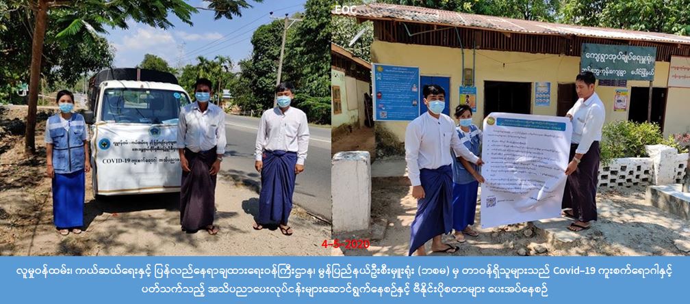 လူမှုဝန်ထမ်း၊ ကယ်ဆယ်ရေးနှင့် ပြန်လည်နေရာချထားရေးဝန်ကြီးဌာန၊ ဘေးအန္တရာယ်ဆိုင်ရာစီမံခန့်ခွဲမှု ဦးစီးဌာန၊ မွန်ပြည်နယ်ဦးစီးမှူးရုံးမှတာဝန်ရှိသူများသည် (၄-၅-၂၀၂၀) ရက်နေ့ မွန်ပြည်နယ်၊ ပေါင်မြို့နယ်၊ ကျုံကကျေးရွာ၊ နတ်ကြီးချောင်ကျေးရွာနှင့် ဘန့်ဘွေးကုန်းကျေးရွာတို့တွင် COVID -19 ကူးစက်ရောဂါနှင့်ပတ်သက်၍ ကြိုတင် ကာကွယ်ထိန်းချုပ်နိုင်ရန် ပြည်သူများထံသို့ အသိပညာပေး ပန်ကြားချက်များအား အသံချဲ့စက်များဖြင့် လှည့်လည် အသိပေးဟောပြောခြင်း၊ ဗီနိုင်းပိုစတာပေးအပ်ခြင်းများ ဆောင်ရွက်ခဲ့ကြောင်း သိရှိရပါသည်။