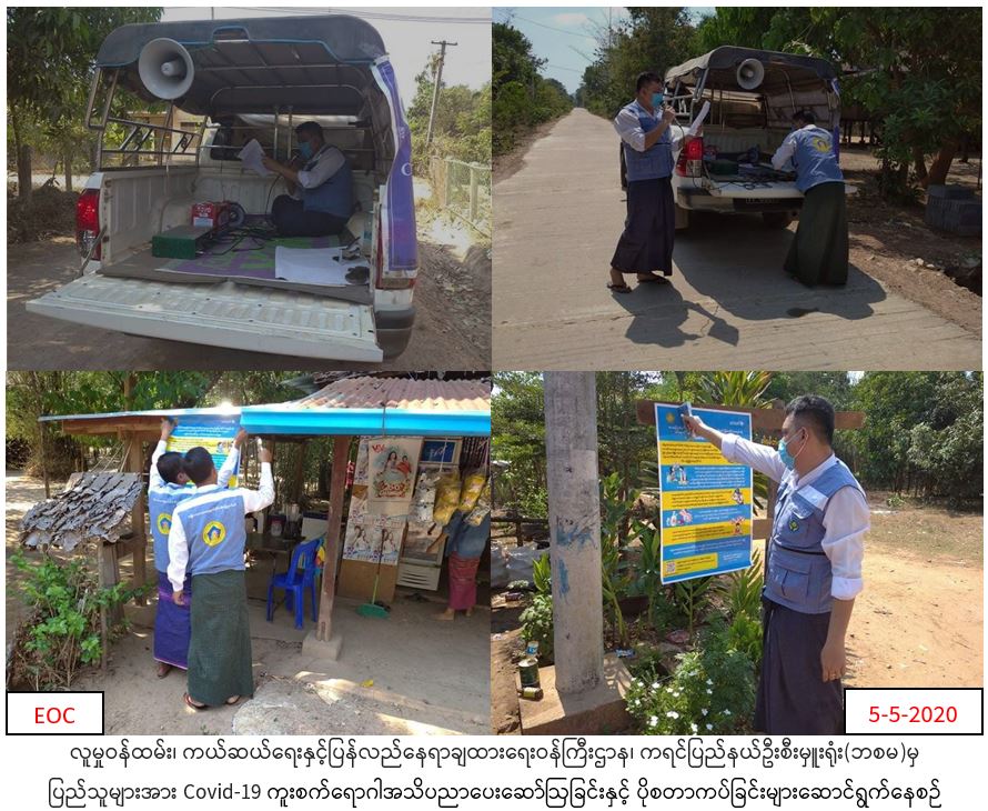 လူမှုဝန်ထမ်း၊ ကယ်ဆယ်ရေးနှင့်ပြန်လည်နေရာချထားရေးဝန်ကြီးဌာန၊ ဘေးအန္တရာယ်ဆိုင်ရာစီမံခန့်ခွဲမှုဦးစီးဌာန၊ ကရင်ပြည်နယ်ဦးစီးမှူးရုံးမှ တာဝန်ရှိသူများသည် (၄. ၅.၂၀၂၀)ရက်နေ့ မနက်(၁၃:ဝ၀)အချိန်မှ နေ့လည် (၁၇:၃၀)အချိန်ထိ ဘားအံမြို့နယ်အတွင်းရှိ လှာကမြင်ကျေးရွာ၊ မဲဘောင်ကျေးရွာ၊ ရသဝေါ်ကျေးရွာ၊ စျေးမသွယ်ကျေးရွာနှင့် တဝန်သံကျေးရွားများသို့သွားရောက်၍ COVID -(19) ရောဂါပျံ့နှံ့မှုများ မဖြစ်ပွားစေရန်အတွက် အသံချဲ့စက်များဖြင့် အသိပညာပေးဟောပြောခြင်းများ ဆောင်ရွက်ခဲ့ကြောင်း သတင်းရရှိပါသည်။