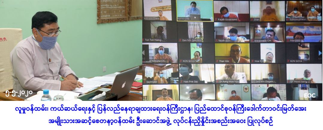 အမျိုးသားအဆင့်စေတနာ့ဝန်ထမ်းဦးဆောင်အဖွဲ့ လုပ်ငန်းညှိနှိုင်းအစည်းအဝေးကို အဖွဲ့၏ အတွင်းရေမှူး၊ လူမှုဝန်ထမ်း၊ ကယ်ဆယ်ရေးနှင့် ပြန်လည်နေရာချထားရေးဝန်ကြီးဌာန ပြည်ထောင်စုဝန်ကြီးဒေါက်တာဝင်းမြတ်အေးသည် အဆိုပါဝန်ကြီးရုံး၌ (၅-၅-၂၀၂၀) ရက်နေ့၊ မွန်းလွဲပိုင်းက Video Conference ဖြင့်ဆောင်ရွက်ခဲ့ပါသည်။