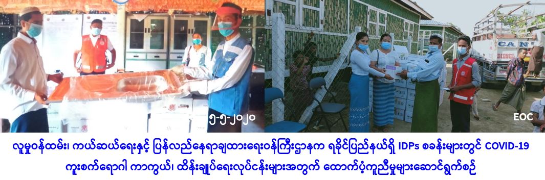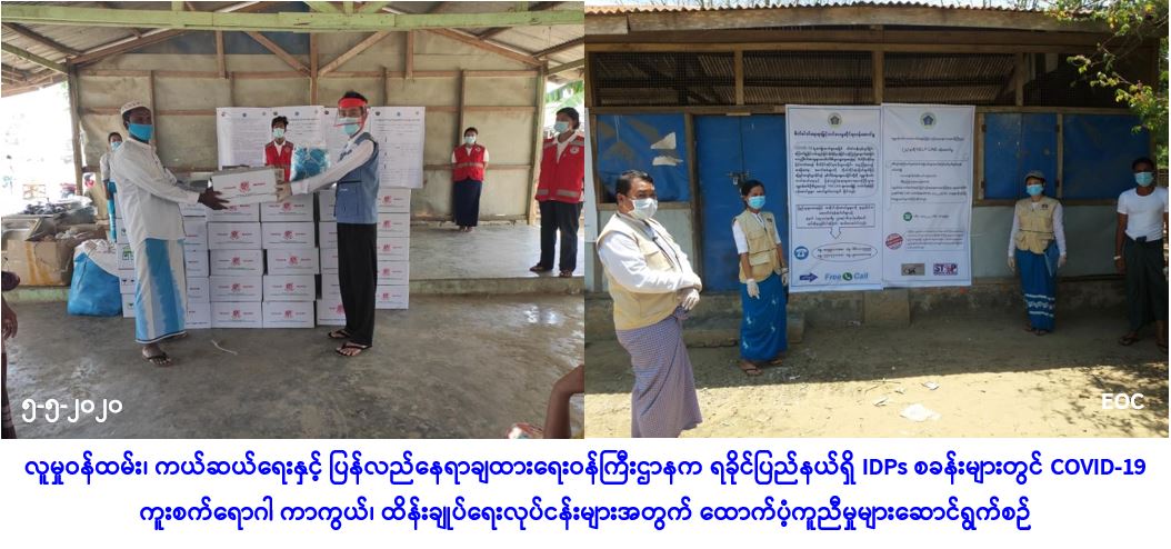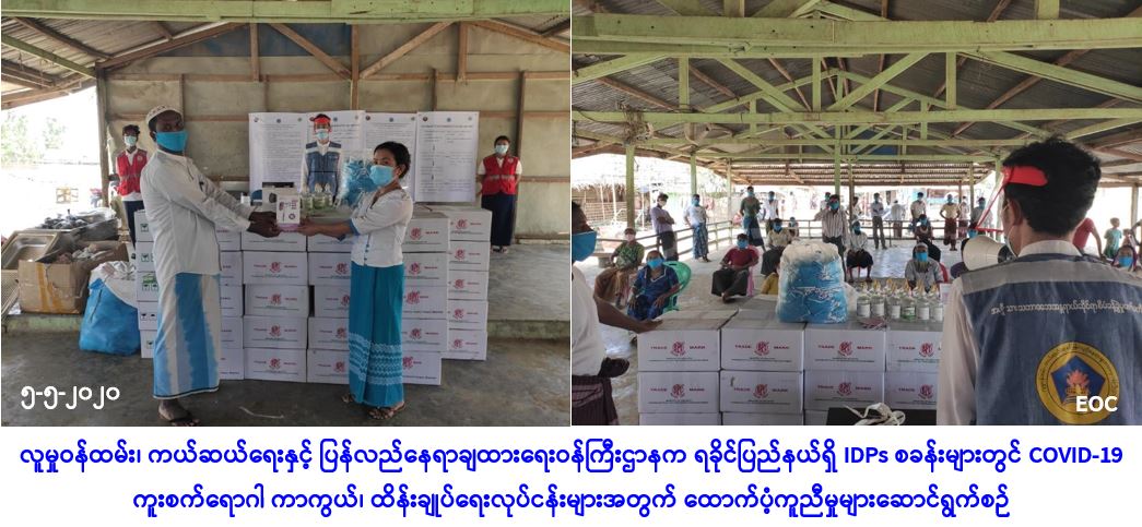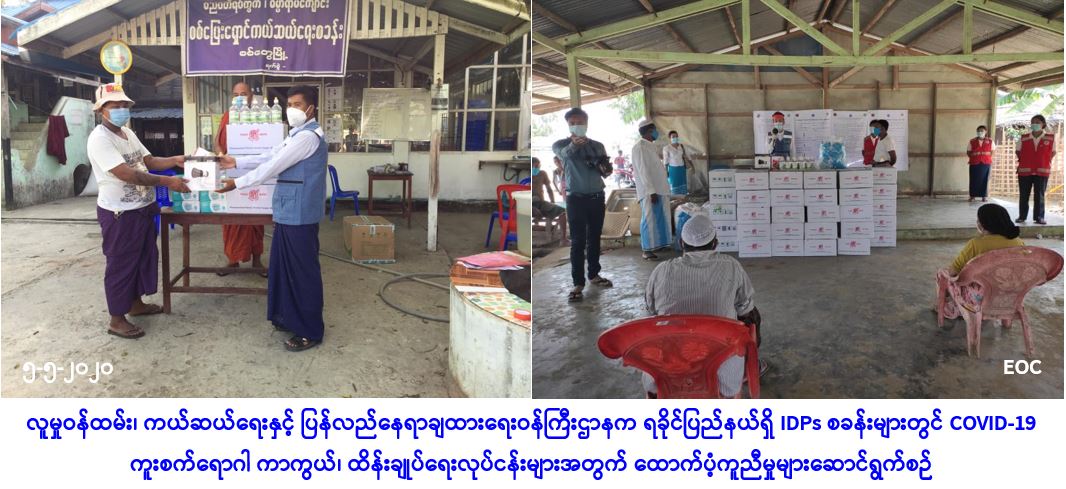 ရခိုင်ပြည်နယ် IDP စခန်းများတွင် (၂၈-၃-၂၀၂၀)ရက်နေ့မှ (၅-၅-၂၀၂၀) ရက်နေ့အထိကာလအတွင်း အသိပညာပေးလုပ်ငန်းများဆောင်ရွက်ခဲ့ပြီး ဆပ်ပြာတောင့် (၁၆၃၃၀)တောင့်၊ Mask (၃၅၄၉၄)ခု၊ လက်ဆေးဘေစင်(၁၂)ခု၊ Hand Sanitizer (၁၆၇၂၇)ဘူး၊ အပူချိန်တိုင်းကိရိယာ(၁၉)ခု၊ Hand Speaker (၁၂)ခုနှင့် Memory Stick (၁၂)ခုတို့အား ထောက်ပံ့ခဲ့ပြီးဖြစ်ကြောင်းနှင့် ဆက်လက်၍ လက်ဆေးဘေစင်နှင့် ဆက်စပ်ပစ္စည်း (၂၇၀)စုံကိုလည်း IDP စခန်းများတွင် အမြန်ဆုံးဆက်လက်တပ်ဆင်ဆောင်ရွက်သွားမည်ဖြစ်ကြောင်း သတင်းရရှိပါသည်။