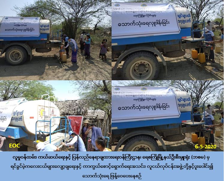 လူမှု၀န်ထမ်း၊ ကယ်ဆယ်ရေးနှင့် ပြန်လည်နေရာချထားရေး၀န်ကြီးဌာန၊ ဘေးအန္တရာယ်ဆိုင်ရာစီမံခန့်ခွဲမှုဦးစီးဌာန၊ ရေစကြိုမြို့နယ်ဦးစီးမှူးရုံးမှ တာဝန်ရှိသူများသည် ရေစကြိုမြို့နယ်၊ ခွေးမြှုပ်ကျေးရွာအုပ်စု၊ ယာကြီးကုန်းကျေးရွာရှိ အိမ်ခြေ (၈၄) လုံး၊ အိမ်ထောင်စု (၈၉) စု၊ လူဦးရေ (၄၁၉) ဦးတို့အတွက် သောက်သုံးရေဂါလံ (၃၆၀၀) အား (၆-၅-၂၀၂၀)ရက်နေ့၊ (၀၉:၃၀) အချိန်တွင်၊ ရင်ခွင်မဲ့ကလေးငယ်များလျော့ချရေးနှင့် ကာကွယ်စောင့်ရှောက်ရေးအသင်း၊ လူငယ်လုပ်ငန်းအဖွဲ့တို့နှင့်ပူးပေါင်းကာ သွားရောက် ဖြန့်ဝေခဲ့ပါကြောင်း သတင်းရရှိပါသည်။