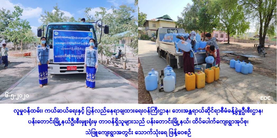 လူမှုဝန်ထမ်း၊ ကယ်ဆယ်ရေးနှင့် ပြန်လည်နေရာချထားရေးဝန်ကြီးဌာန၊ ဘေးအန္တရာယ်ဆိုင်ရာ စီမံခန့်ခွဲမှုဦးစီးဌာန၊ ပန်းတောင်မြို့နယ်ဦးစီးမှူးရုံးမှ တာဝန်ရှိသူများသည် (၆-၅-၂၀၂၀) ရက်နေ့၊ (၀၈:၃၀) နာရီအချိန်တွင် ပန်းတောင်းမြို့နယ်၊ ထိပ်ပေါက်ကျေးရွာအုပ်စု၊ သဲဖြူကျေးရွာအတွင်း သောက်သုံးရေပြတ်လပ်မှုနှင့်ကြုံတွေ့နေရသော အိမ်ထောင်စု(၁၂၉)စု၊ လူဦးရေ(၄၄၇)ဦးအတွက် သောက်ရေ(၂၀)လီတာ (၃၈၇)ဗူး၊ စုစုပေါင်း(၁၉၃၆)ဂါလံနှင့် သုံးရေဂါလံ(၈၀၀)အား သွားရောက် ဖြန့်ဝေခဲ့ကြောင်း သတင်းရရှိပါသည်။