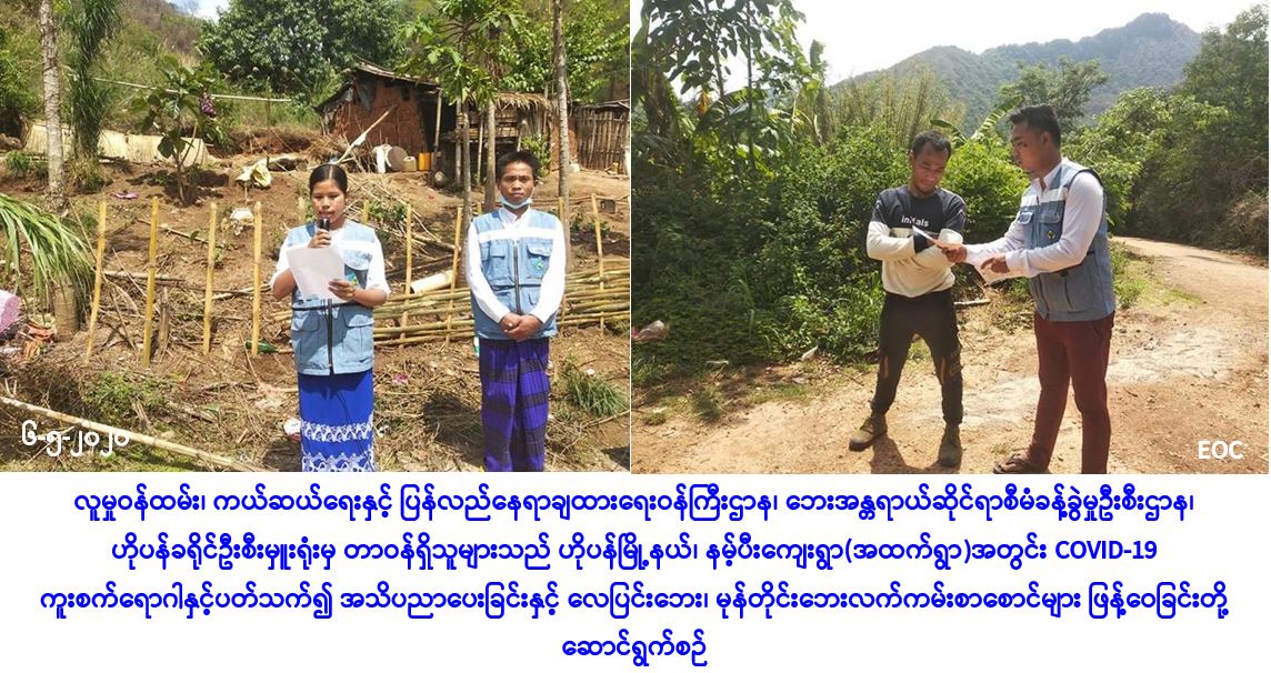 လူမှုဝန်ထမ်း၊ ကယ်ဆယ်ရေးနှင့် ပြန်လည်နေရာချထားရေးဝန်ကြီးဌာန၊ ဘေးအန္တရာယ်ဆိုင်ရာ စီမံခန့်ခွဲမှုဦးစီးဌာန၊ ဟိုပန်ခရိုင်ဦးစီးမှူးရုံးမှ တာဝန်ရှိသူများသည် (၆-၅-၂၀၂၀) ရက်နေ့တွင် ဟိုပန်မြို့နယ်၊ နမ့်ပီးကျေးရွာ(အထက်ရွာ)အတွင်း COVID-19 ရောဂါ ကူးစက်ပျံ့နှံ့မှုများ မဖြစ်ပွားစေရန်အတွက် သိရှိလိုက်နာဆောင်ရွက်ရမည့်အချက်များအား အသိပညာပေးဟောပြောခြင်း၊ COVID-19 ကူးစက်ရောဂါနှင့်ပတ်သက်သည့် လက်ကမ်းစာစောင်များ ဖြန့်ဝေခြင်းနှင့် လေပြင်းဘေး၊ မုန်တိုင်းဘေးလက်ကမ်းစာစောင်များ ဖြန့်ဝေခြင်းတို့ ဆောင်ရွက်ခဲ့ကြောင်း သတင်းရရှိပါသည်။