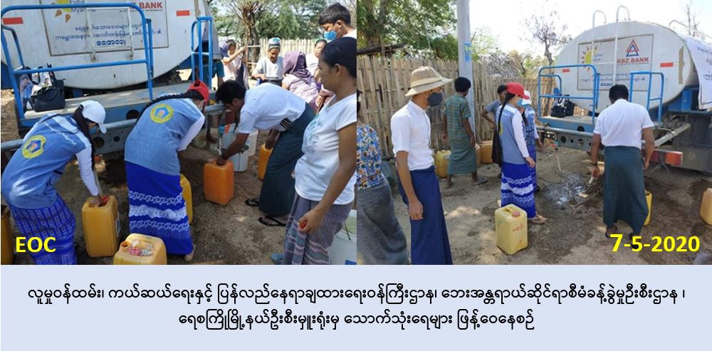 လူမှုဝန်ထမ်း၊ ကယ်ဆယ်ရေးနှင့် ပြန်လည်နေရာချထားရေးဝန်ကြီးဌာန၊ ဘေးအန္တရာယ်ဆိုင်ရာ စီမံခန့်ခွဲမှုဦးစီးဌာန၊ ရေစကြိုမြို့နယ်ဦးစီးမှူးရုံးမှ တာဝန်ရှိသူများသည် ရေစကြိုမြို့နယ်၊ ထန်းတိုကျေးရွာအုပ်စု၊ မြစ်လှချောင်ကျေးရွာရှိ အိမ်ခြေ (၈၀) လုံး၊ အိမ်ထောင်စု (၉၄)စု၊ လူဦးရေ (၃၉၅) ဦးတို့အတွက် သောက်သုံးရေဂါလံ (၃၆၀၀) အား (၇-၅-၂၀၂၀)ရက်နေ့၊(၀၉:၃၀) အချိန် တွင်၊ ရင်ခွင်မဲ့ကလေးငယ်များလျေှာ့ချရေးနှင့် ကာကွယ်စောင့်ရှောက်ရေးအသင်း၊ လူငယ် လုပ်ငန်းအဖွဲ့တို့နှင့် ပူးပေါင်းကာ သွားရောက်ဖြန့်ဝေခဲ့ပါကြောင်း သတင်းရရှိပါသည်