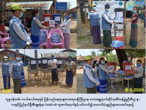 လူမှုဝန်ထမ်း၊ ကယ်ဆယ်ရေးနှင့် ပြန်လည်နေရာချထားရေးဝန်ကြီးဌာန၊ ဘေးအန္တရာယ်ဆိုင်ရာ စီမံခန့်ခွဲမှုဦးစီးဌာန၊ ကချင်ပြည်နယ်ဦးစီးမှူးရုံးမှ တာဝန်ရှိသူများသည် (၆-၅-၂၀၂၀) ရက်နေ့ တွင် Covid-19 နှင့် ပတ်သက်၍ မြစ်ကြီးနားမြို့နယ်ရှိ၊ စီတာပူ သီတာအေး၊ စီတာပူ ဆွတ်ငိုင်တောင်၊ မန်ခိန်နှစ်ခြင်း၊ ရွှေစက်နှစ်ခြင်း၊ ပလန ကက်သလစ် လူငယ်ဗဟိုကျောင်း၊ ဂျန်မိုင်ကောင်းနှစ်ခြင်း၊ ဂျန်မိုင်ကောင်းRC၊ မော်ဖောင်းလဝေါ်နှစ်ခြင်း၊ မော်ဖောင်းခါနန်နှစ်ခြင်း၊ နန်းကွေ့စိန်ယောဟန် IDPs စခန်းများသို့ အပူချိန်တိုင်းကိရိယာ (၁၁) ခု၊ လက်ဆေးစင် (၂၃) ခု၊ ဗွီနိုင်းပိုစတာ (၄) ခု၊ Hand Speaker (၁၀) ခု၊ Memory Stick (၁၀) ခု၊ အဝတ် Mask(၁၁,၇၆၂)ခုတို့ အားသွားရောက်ပေးအပ်ခဲ့ပါသည်။