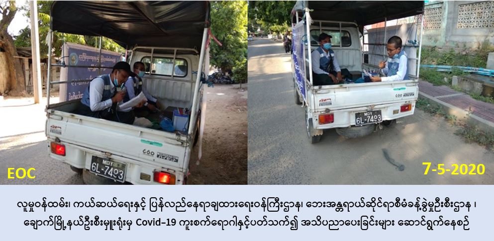 လူမှုဝန်ထမ်း၊ ကယ်ဆယ်ရေးနှင့် ပြန်လည်နေရာချထားရေးဝန်ကြီးဌာန၊ ဘေးအန္တရာယ်ဆိုင်ရာ စီမံခန့်ခွဲမှုဦးစီးဌာန၊ မကွေးတိုင်းဒေသကြီး၊ ချောက်မြို့နယ်ဦးစီးမှူးရုံးမှ တာဝန်ရှိသူများသည် (၇-၅-၂၀၂၀) ရက်နေ့ ၊(၈:၃၀) နာရီမှ (၁၂:၃၀) နာရီအချိန်ထိ မကွေးခရိုင်၊ ချောက်မြို့နယ် အတွင်းရှိ ချောက်မြို့အမှတ် (၁၁၊ ၁၂၊ ၁၃၊ ၁၄၊ ၁၅) ရပ်ကွက်များသို့ COVID-19 ရောဂါနှင့် ပတ်သက်၍ ကာကွယ်၊ တားဆီး၊ ထိန်းချုပ်၊ ကုသရေးဆိုင်ရာပြည်သူလူထု အသိပညာပေး ပန်ကြားချက်များကို လှည့်လည်ဟောပြောခြင်းလုပ်ငန်းများကို ဆောင်ရွက်ခဲ့ပါကြောင်း သတင်း သတင်းရရှိပါသည်။