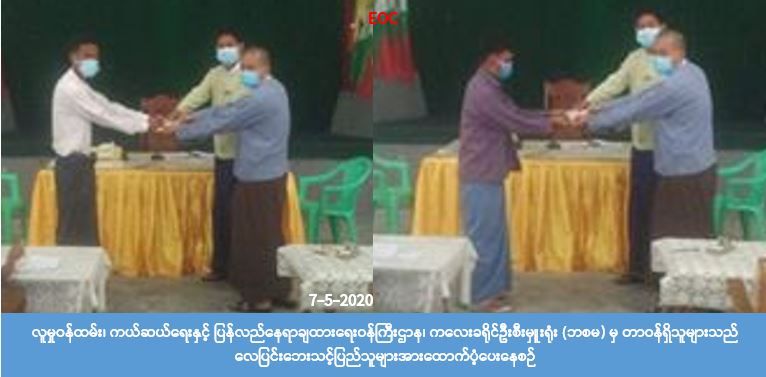 လူမှုဝန်ထမ်း၊ ကယ်ဆယ်ရေးနှင့် ပြန်လည်နေရာချထားရေးဝန်ကြီးဌာန၊ ဘေးအန္တရာယ်ဆိုင်ရာစီမံခန့်ခွဲမှု ဦးစီးဌာန၊ ကလေးခရိုင်ဦးစီးမှူးရုံးမှ တာဝန်ရှိသူများသည် (၆-၅-၂၀၂၀)နေ့ (၁၃:၃၀)အချိန် လေပြင်း တိုက်ခတ်မှုကြောင့် ကလေးမြို့နယ်၊ ကျေးရွာ(၂၆) ရွာရှိ အိမ်ခြေ (၈၂) လုံးနှင့် ဘုန်းကြီးကျောင်း (၂) ကျောင်း အမိုးလန်ပျက်စီးခဲ့ရာ အိမ်ထောင်စု(၈၄)စု၊ လူဦးရေ (၃၆၂)ဦးအတွက် ဆန်ရိက္ခာဖိုးငွေ (၇၆၀,၂၀၀/-) ကျပ်နှင့် အိမ်ဆောက်ပစ္စည်းဖိုးထောက်ပံ့ငွေ (၂,၂၃၀,၀၀၀/-)ကျပ်၊ စုစုပေါင်း ထောက်ပံ့ငွေ (၂,၉၉၀,၂၀၀/-) ကျပ်တို့ကို (၇-၅-၂၀၂၀)ရက်နေ့ (၁၅:၀၀)အချိန်တွင် မြို့နယ်အုပ်ချုပ်ရေးမှူးနှင့်အတူ အထွေထွေအုပ်ချုပ်ရေးဦးစီးဌာန အစည်းဝေးခန်းမ၌ ဘေးသင့်ပြည်သူများထံ ထောက်ပံ့ပေးခဲ့ကြောင်း သိရှိရပါသည်။