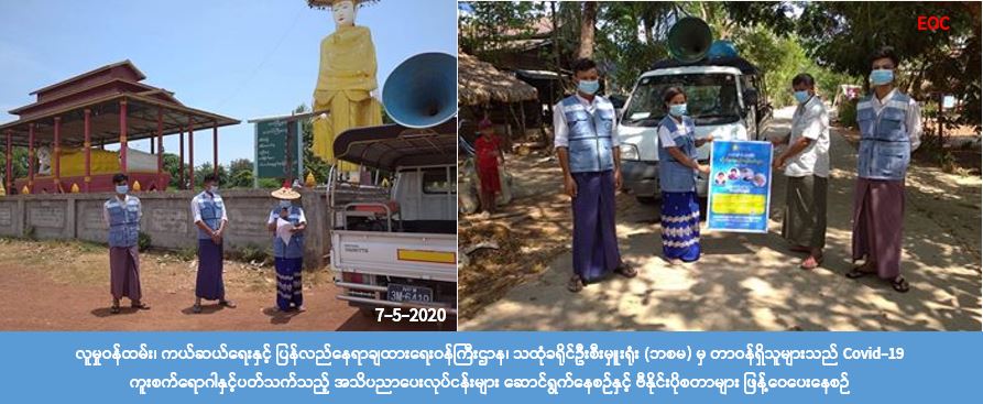လူမှုဝန်ထမ်း၊ ကယ်ဆယ်ရေးနှင့် ပြန်လည်နေရာချထားရေးဝန်ကြီး ဌာန၊ ဘေးအန္တရာယ်ဆိုင်ရာစီမံခန့်ခွဲမှု ဦးစီးဌာန၊ သထုံခရိုင်ဦးစီးမှူးရုံးမှ တာဝန်ရှိသူများသည် (၇-၅-၂၀၂၀) ရက်နေ့ (၁၀:၃၀)နာရီအချိန်မှ (၁၆:၃၀) နာရီအချိန်ထိ မွန်ပြည်နယ်၊ သထုံခရိုင်၊ သထုံမြို့နယ် တောကြီးကျေးရွာနှင့် သောင်ကြီးကျေးရွာ တို့တွင် COVID -19 ကူးစက်ရောဂါနှင့်ပတ်သက်၍ အသိပညာပေးခြင်းနှင့် ဗီနိုင်းပိုစတာကပ်ခြင်းတို့ကို ဆောင်ရွက်ခဲ့ကြောင်း သိရှိရပါသည်။
