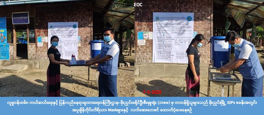 လူမှုဝန်ထမ်း၊ကယ်ဆယ်ရေးနှင့်ပြန်လည်နေရာချထားရေးဝန်ကြီးဌာန၊ ဘေးအန္တရာယ်ဆိုင်ရာစီမံခန့်ခွဲမှု ဦးစီးဌာန၊ မိုးညှင်းခရိုင်ဦးစီးမှူးရုံးမှတာဝန်ရှိသူများသည် (၇-၅-၂၀၂၀)ရက်နေ့ (၁၅၄၀)အချိန်၌ မိုးညှင်း မြို့၊ စိန်ပတ်ထရိတ်ဘုရားကျောင်း IDPs စခန်းရှိပြည်သူများအား COVID-19 ကူးစက်ရောဂါနှင့် ပတ်သက် ၍ ဆောင်ရန်၊ ရှောင်ရန်အချက်များ အသိပညာပေးဆောင်ရွက်ခဲ့ပြီး စခန်းရှိ အိမ်ထောင်စု (၁၂) စုမှ လူဦးရေ (၆၇)ဦးအတွက် လက်ဆေးဘေစင် (၁)စုံ၊ အပူချိန်တိုင်းကိရိယာ (၁) ခု၊ Hand Speaker (၁) ခု၊ Momery Stick (၁)ခု၊ အဝတ် Mask (၁၃၄) ခုနှင့် အသိပညာပေးဗွီနိုင်း (၁) ခုတို့ကို ထောက်ပံ့ပေးခဲ့ ပါကြောင်းသိရှိရပါသည်။