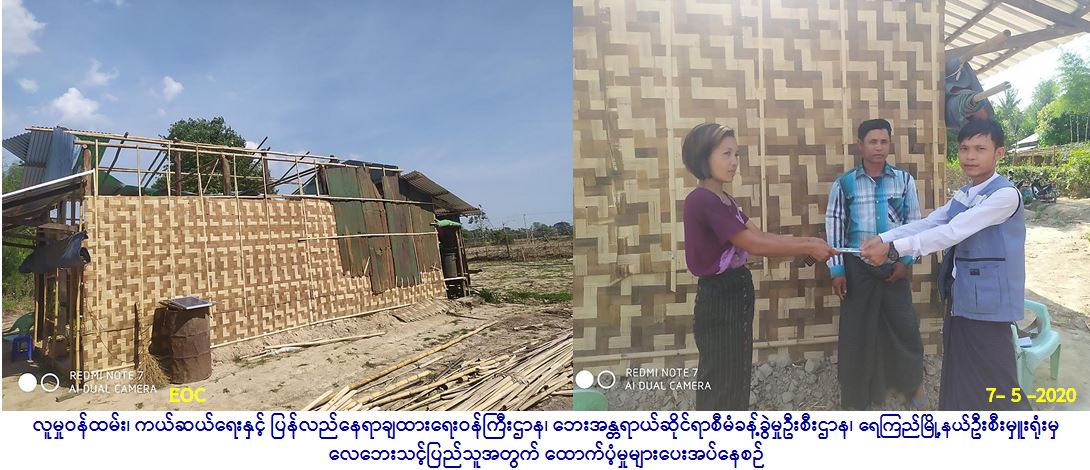 လူမှုဝန်ထမ်း၊ ကယ်ဆယ်ရေးနှင့် ပြန်လည်နေရာချထားရေးဝန်ကြီးဌာန၊ ဘေးအန္တရာယ်ဆိုင်ရာစီမံခန့်ခွဲမှုဉီးစီးဌာန၊ ရေကြည် မြို့နယ်ဦးစီးမှူးရုံးမှ တာဝန်ရှိသူများသည် ရေကြည်မြို့နယ်၊ ကွမ်းသီးချောင်းကျေးရွာအုပ်စု၊ အရှေ့ရွာသစ်ကျေးရွာတွင် (၅.၅.၂၀၂၀)ရက်နေ့၌ ဖြစ်ပွားသောလေဘေးကြောင့် အမိုးလန်ပျက်စီး နေအိမ်(၁)လုံးအတွက် အိမ်ဆောက်ပစ္စည်းဖိုး ရန်ပုံငွ ေ(၅၀၀၀ဝ/-)၊ လူဦးရေ (၃) ဦးအတွက် ဆန်ရိက္ခာ (၇) ရက်စာရန်ပုံငွေ (၆၃၀ဝ/-)၊ စုစုပေါင်းရန်ပုံငွေ (၅၆၃၀ဝ/-)ကျပ်အား (၇.၅.၂၀၂၀)ရက်နေ့ (၁၅:၂၀)နာရီအချိန်တွင် ဘေးသင့်ပြည်သူများလက်ဝယ်အရောက်ထောက်ပံ့ပေးခဲ့ပါကြောင်း သတင်းရရှိပါသည်။