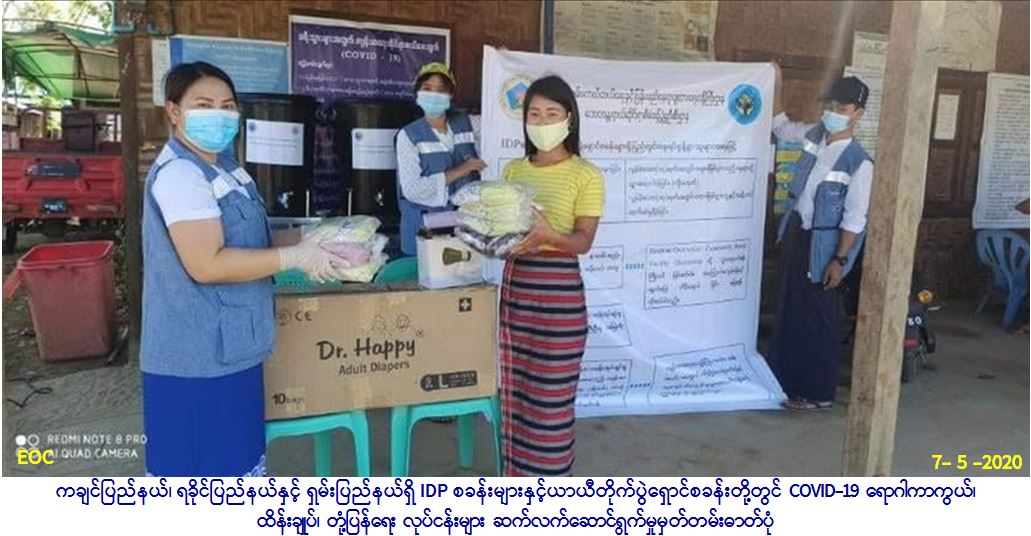 ၂။ (၇-၅-၂၀၂၀)ရက်နေ့တွင် ကချင်ပြည်နယ်၊ ဝိုင်းမော်မြို့ရှိ မြို့မနှစ်ခြင်း၊ လော်ဝေါ် နှစ်ခြင်း၊ မူရင်းနှစ်ခြင်း၊ လော်ဝေါ်အေဂျီ၊ လီဆူနှစ်ခြင်း၊ မဒိန်၊ ခတ်ချို၊ နောင်ဟီး၊ မိုင်းနားကက်သလစ်၊ မိုင်းနားဖွံ့ဖြိုးရေးခြံ IDP စခန်း စုစုပေါင်း(၁၀)ခုသို့ သွားရောက်၍ Mask(၈၅၅၄)ခု၊ လက်ဆေးစင်(၁၀)ခု၊ အပူချိန်တိုင်းကိရိယာ (၂)ခု၊ Handspaker(၁၀)ခု၊ COVID-19 အသိပညာပေးအသံဖိုင်ထည့်သွင်းထားသော Memory Stick (၁၀)ခုနှင့် ဗွီနိုင်း(၂)ချပ်တို့အား ထောက်ပံ့ခဲ့ပါသည်။